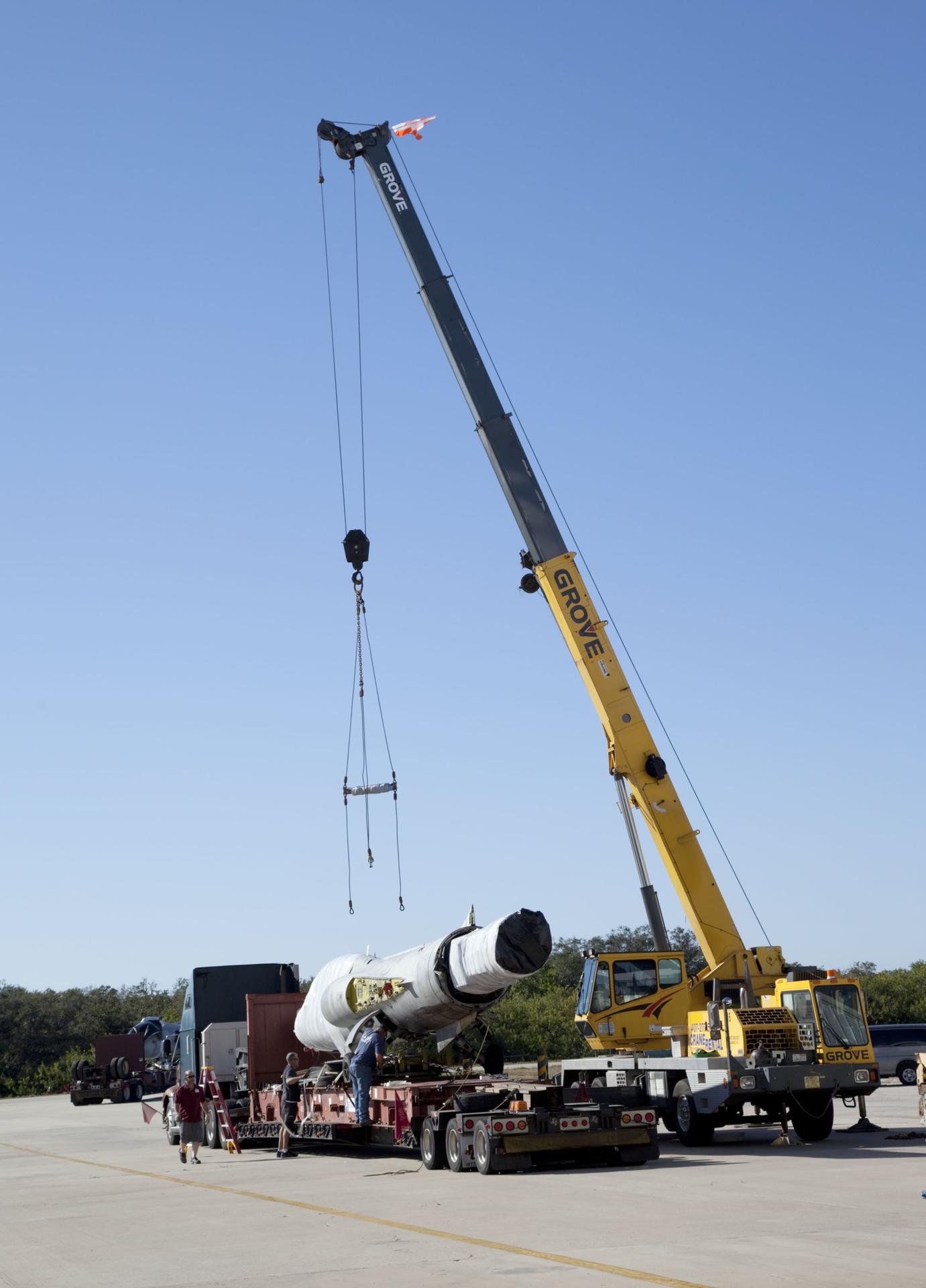 CAPE CANAVERAL, Fla. -- A crane lifts an F-104 Starfighter off the bed of a truck at NASA's Kennedy Space Center in Florida on Jan. 19, 2012. The aircraft is one of five delivered to the company recently. They will be reassembled to fly research and development and other missions. Starfighters operates out of a hangar at the Shuttle Landing Facility at Kennedy under an agreement with Kennedy. Photo credit: NASA/Frankie Martin