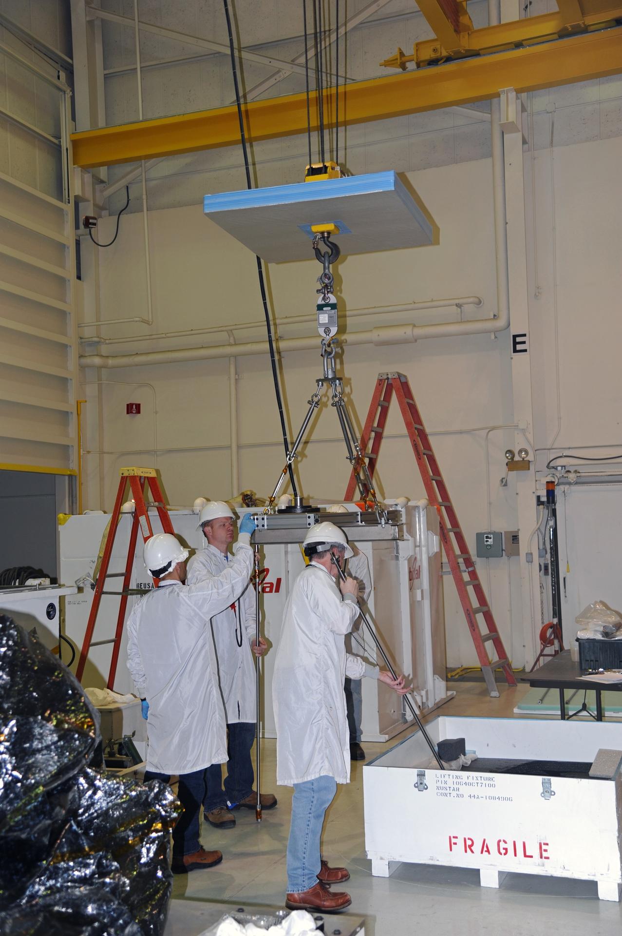 VANDENBERG AIR FORCE BASE, Calif. -- In the airlock of processing facility 1555 at Vandenberg Air Force Base (VAFB) in California, workers prepare a lifting fixture to hoist NASA's Nuclear Spectroscopic Telescope Array (NuSTAR) from its shipping container. The spacecraft arrived at VAFB Jan. 27 after a cross-country trip which began from Orbital Sciences' manufacturing plant in Dulles, Va., on Jan. 24. Next, NuSTAR will be transferred from the airlock into the processing hangar, joining the Pegasus XL rocket that is set to carry it to space. After checkout and other processing activities are complete, the spacecraft will be integrated with the Pegasus in mid-February and encapsulation in the vehicle fairing will follow. The rocket and spacecraft then will be flown on Orbital's L-1011 carrier aircraft to the Ronald Reagan Ballistic Missile Defense Test Site at the Pacific Ocean's Kwajalein Atoll for launch in March. The high-energy X-ray telescope will conduct a census for black holes, map radioactive material in young supernovae remnants, and study the origins of cosmic rays and the extreme physics around collapsed stars. For more information, visit http://www.nasa.gov/nustar. Photo credit: NASA/Randy Beaudoin, VAFB