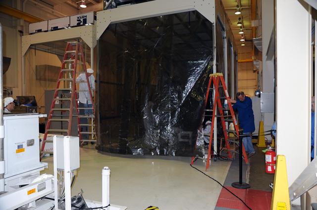 VANDENBERG AIR FORCE BASE, Calif. -- In the airlock of processing facility 1555 at Vandenberg Air Force Base (VAFB) in California, NASA's Nuclear Spectroscopic Telescope Array (NuSTAR) rests on a handling dolly in a environmental enclosure, awaiting further processing. The spacecraft arrived at VAFB Jan. 27 after a cross-country trip which began from Orbital Sciences' manufacturing plant in Dulles, Va., on Jan. 24. Next, NuSTAR will be transferred from the airlock into the processing hangar, joining the Pegasus XL rocket that is set to carry it to space. After checkout and other processing activities are complete, the spacecraft will be integrated with the Pegasus in mid-February and encapsulation in the vehicle fairing will follow. The rocket and spacecraft then will be flown on Orbital's L-1011 carrier aircraft to the Ronald Reagan Ballistic Missile Defense Test Site at the Pacific Ocean's Kwajalein Atoll for launch in March. The high-energy X-ray telescope will conduct a census for black holes, map radioactive material in young supernovae remnants, and study the origins of cosmic rays and the extreme physics around collapsed stars. For more information, visit http://www.nasa.gov/nustar. Photo credit: NASA/Randy Beaudoin, VAFB