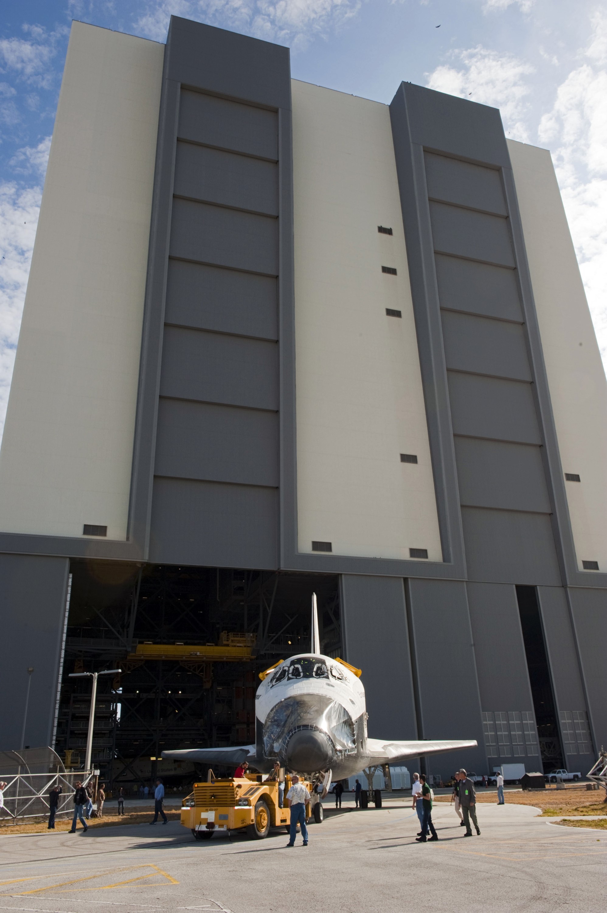CAPE CANAVERAL, Fla. – With the massive doors of the Vehicle Assembly Building at NASA’s Kennedy Space Center in Florida in the background, space shuttle Endeavour is being towed from the VAB to Orbiter Processing Facility-2. Shuttle Endeavour will remain in OPF-2 so that the orbiter maneuvering system (OMS) pods and forward reaction control system can be installed. Technicians also will offload water and Freon gas from lines located in Endeavour’s midbody. The work is part of Endeavour’s transition and retirement processing. The spacecraft is being prepared for public display at the California Science Center in Los Angeles. Endeavour flew 25 missions, spent 299 days in space, orbited Earth 4,671 times and traveled 122, 883, 151 miles over the course of its 19-year career. Endeavour’s STS-134 and final mission was completed after landing on June 1, 2011. Photo credit: Kim Shiflett