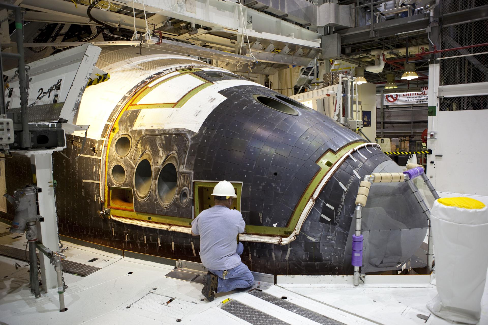 CAPE CANAVERAL, Fla. – In Orbiter Processing Facility-2 at NASA’s Kennedy Space Center in Florida, one of several technicians installs the forward reaction control system (FRCS) on space shuttle Endeavour. The work is part of the Space Shuttle Program transition and retirement processing of Endeavour. The FRCS helped maneuver a shuttle while it was in orbit. The FRCS was removed from Endeavour and sent to White Sands Test Facility in N.M. to be cleaned of its toxic propellants. Endeavour is being prepared for display at the California Science Center in Los Angeles. Photo credit: NASA/Dimitri Gerondidakis