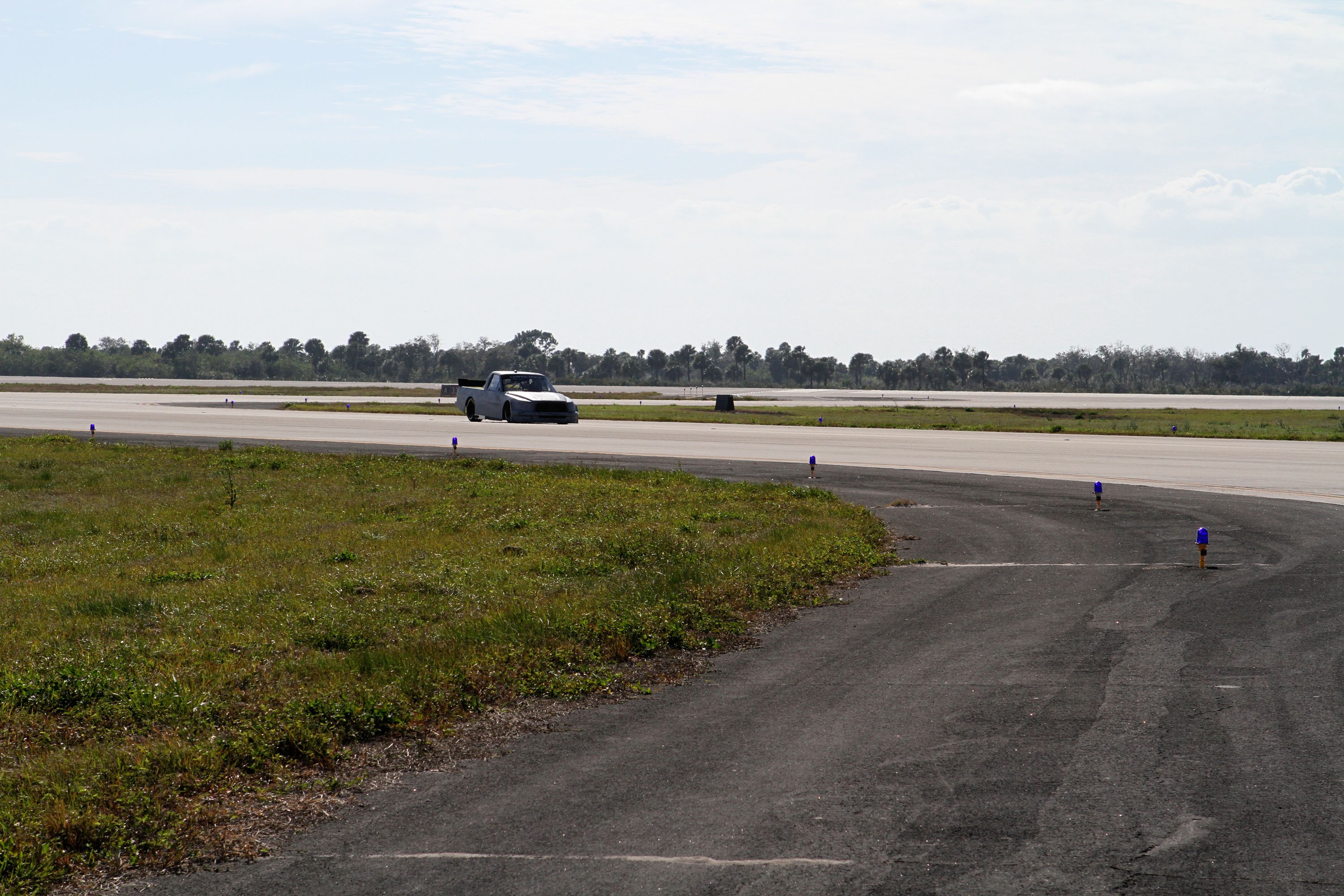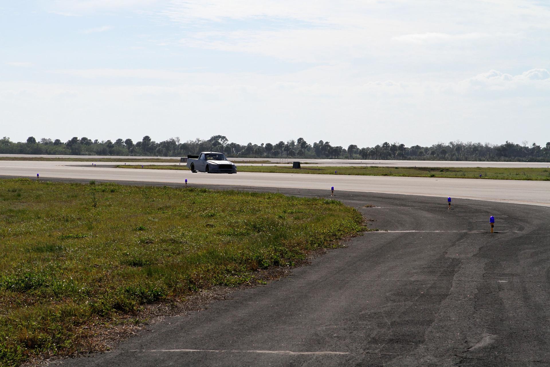 CAPE CANAVERAL, Fla. - At NASA’s Kennedy Space Center in Florida, NASCAR racer Jason Leffler with Kyle Busch Motorsports (KBM) drives his instrument-laden vehicle back from the three-mile-long drive down the Shuttle Landing Facility runway. The operation is part of KBMs’ program to test aerodynamic and real-world capabilities on one of the flattest surfaces in the world. Racing teams have been using the runway for testing since 2008. KBM signed a Space Act Agreement with NASA to use the facility’s runway. Photo Credit: NASA/Kim Shiflett