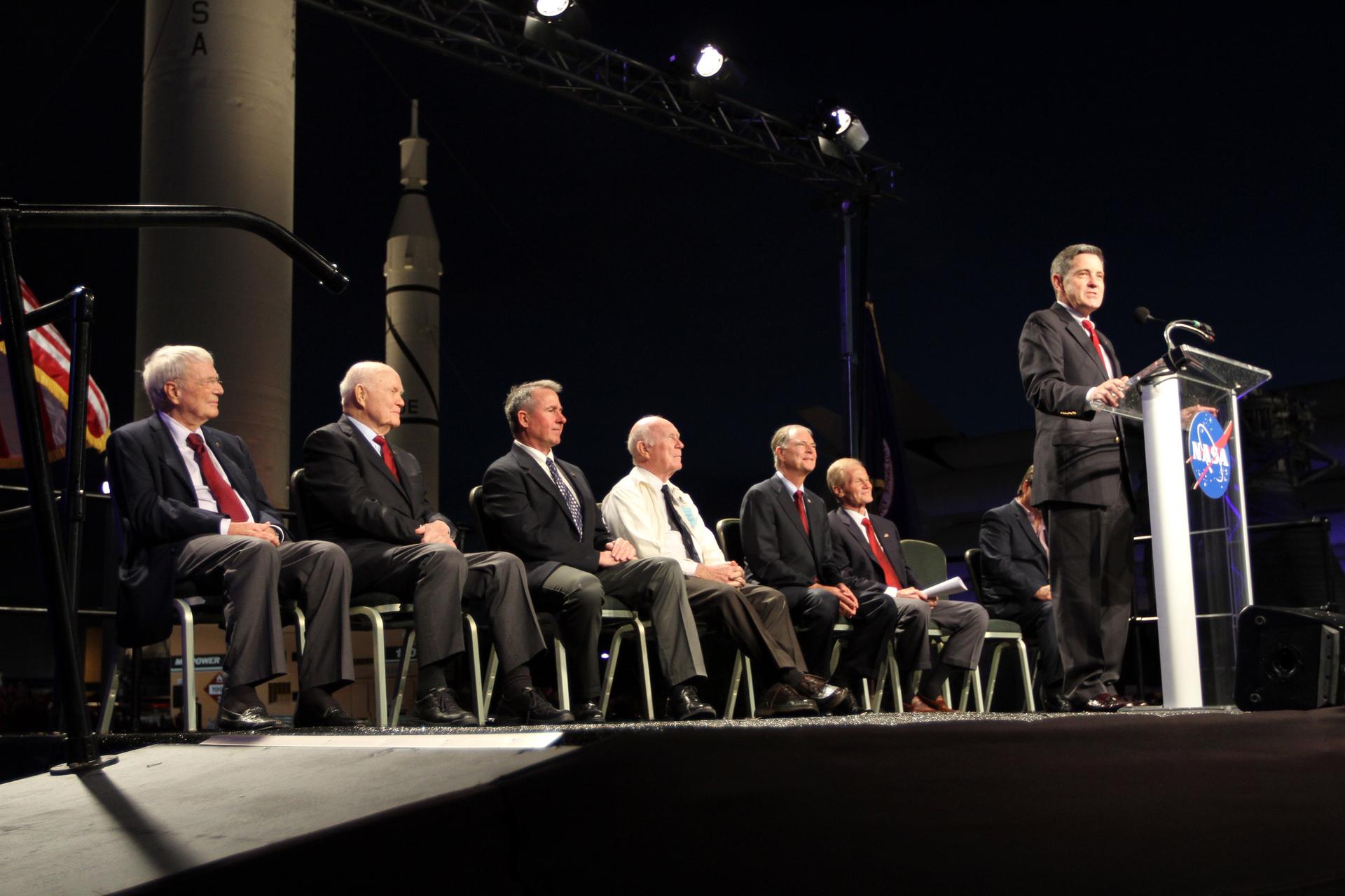 CAPE CANAVERAL, Fla. -- Kennedy Space Center Director Bob Cabana makes remarks during the "On Shoulders of Giants" program celebrating 50 years of Americans in orbit, an era which began with John Glenn's MA-6 mission on Feb. 20, 1962. The event was conducted in the Rocket Garden at the Kennedy Space Center Visitor Complex in Florida a few miles from the launch pad where Glenn and Scott Carpenter took flight in Mercury spacecraft. Glenn's launch aboard an Atlas rocket took with it the hopes of an entire nation and ushered in a new era of space travel that eventually led to Americans walking on the moon by the end of the 1960s. Glenn soon was followed into orbit by Scott Carpenter, Walter Schirra and Gordon Cooper. Their fellow Mercury astronauts Alan Shepard and Virgil "Gus" Grissom flew earlier suborbital flights. Deke Slayton, a member of NASA's original Mercury 7 astronauts, was grounded by a medical condition until the Apollo-Soyuz Test Project in 1975. Photo credit: Kim Shiflett