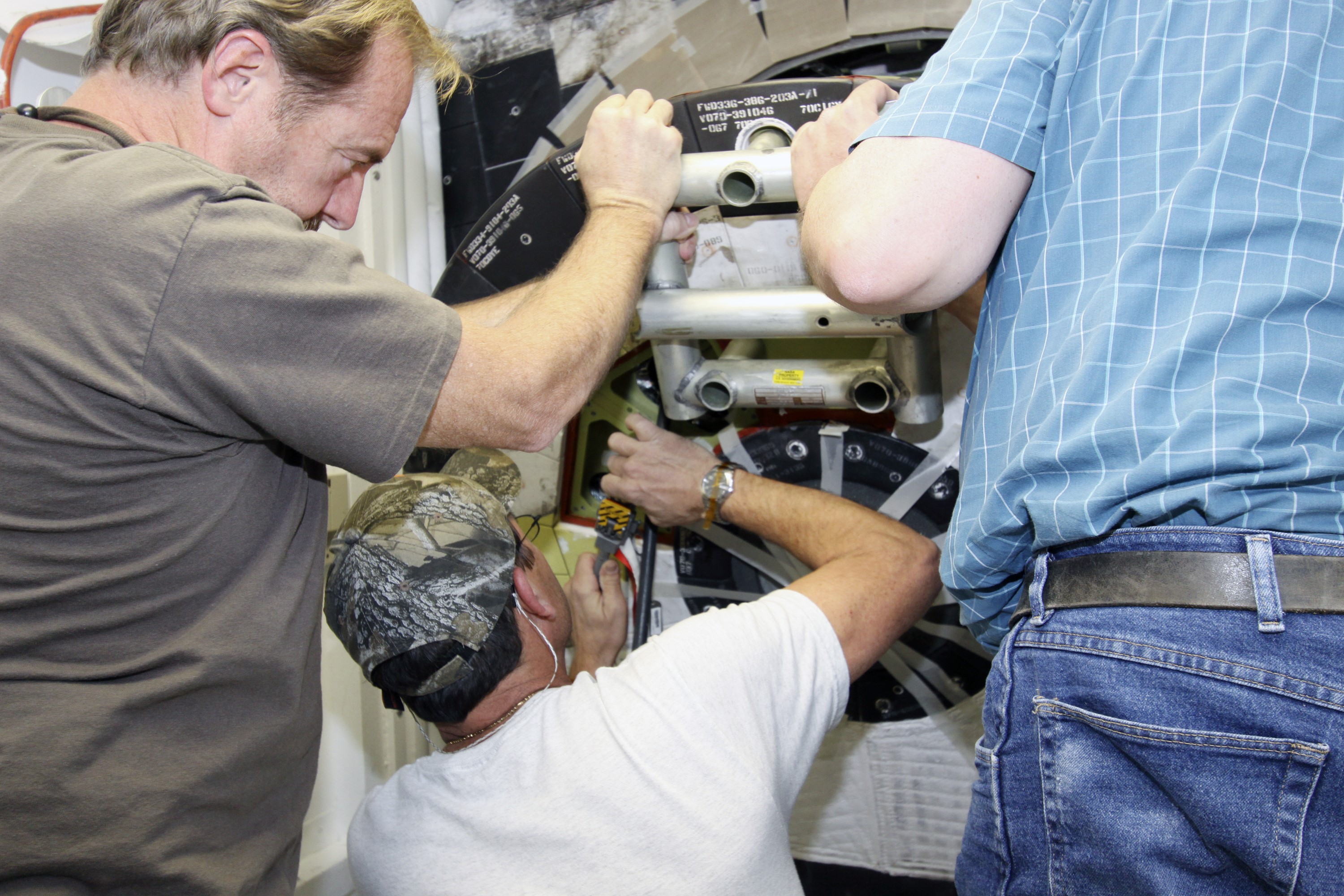 CAPE CANAVERAL, Fla. -- Inside Orbiter Processing Facility-1 at NASA’s Kennedy Space Center in Florida, technicians position space shuttle Discovery’s access hatch for final close out. The work is part of the Space Shuttle Program’s transition and retirement processing of shuttle Discovery, which is being prepared for display at Smithsonian’s National Air and Space Museum, Steven F. Udvar-Hazy Center in Chantilly, Va. Discovery is scheduled to be transported atop a NASA Shuttle Carrier Aircraft modified 747 jet to Dulles International Airport in Virginia on April 17 and then be transported to the Smithsonian on April 19. For more information, visit http://www.nasa.gov/shuttle. Photo credit: NASA/Jim Grossmann