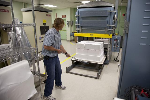 CAPE CANAVERAL, Fla. -- Tim Wright, a United Space Alliance engineering manager at NASA's Kennedy Space Center in Florida, unloads the heat shield tiles that will be installed to the backshell of the Orion Multi-Purpose Crew Vehicle's Exploration Flight Test EFT-1 capsule. The tiles are being manufactured and inspected in Kennedy's Thermal Protection System Facility. The tiles will be baked at 2,200 degrees F to cure their ceramic coating. EFT-1 will be used during Orion's first test flight in space. For more information, visit www.nasa.gov/orion. Photo credit: Frankie Martin