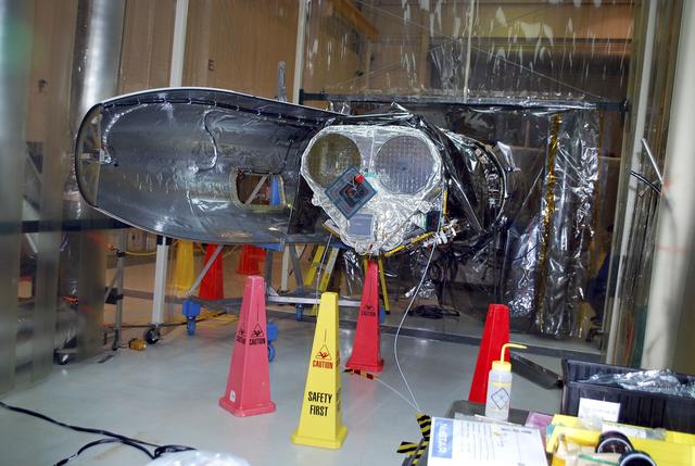 VANDENBERG AIR FORCE BASE, Calif. -- NASA's Nuclear Spectroscopic Telescope Array NuSTAR spacecraft is wrapped in its protective cover and half of its payload fairing is behind it in processing facility 1555 at Vandenberg Air Force Base in California. Technicians are performing fairing closeout work in preparation for fairing installation around the spacecraft, which is scheduled to begin March 2. The cover protecting NuSTAR's delicate instruments will be removed prior to the fairing installation. The fairing will protect the spacecraft from the heat and aerodynamic pressure generated during ascent to orbit aboard an Orbital Sciences Pegasus XL rocket. After processing of the rocket and spacecraft are complete, they will be flown on Orbital's L-1011 carrier aircraft from Vandenberg to the Ronald Reagan Ballistic Missile Defense Test Site on the Pacific Ocean’s Kwajalein Atoll for launch. The high-energy X-ray telescope will conduct a census of black holes, map radioactive material in young supernovae remnants, and study the origins of cosmic rays and the extreme physics around collapsed stars. For more information, visit http://www.nasa.gov/nustar. Photo credit: NASA/Randy Beaudoin, VAFB
