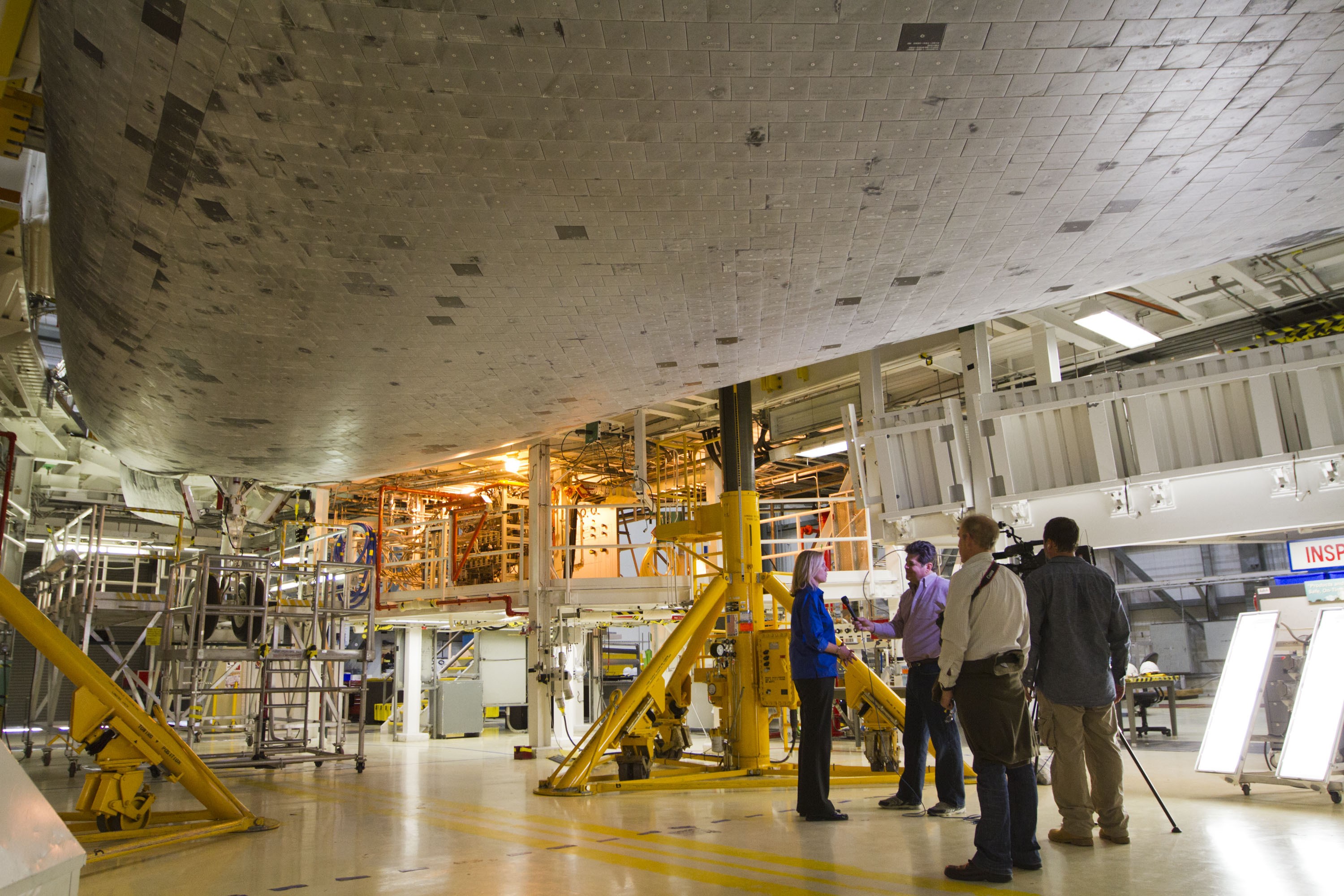 CAPE CANAVERAL, Fla. -- Standing beneath the midbody of space shuttle Endeavour, members of the news media interview Stephanie Stilson, NASA flow director for the shuttles' transition and retirement, inside Orbiter Processing Facility-2 at NASA's Kennedy Space Center in Florida. Stilson was one of several shuttle experts available for interviews around the outside of Endeavour and inside the shuttle's crew compartment. Ongoing transition and retirement activities are preparing the spacecraft for public display at the California Science Center in Los Angeles. Endeavour flew 25 missions during its 19-year career. Photo credit: NASA/Kim Shiflett
