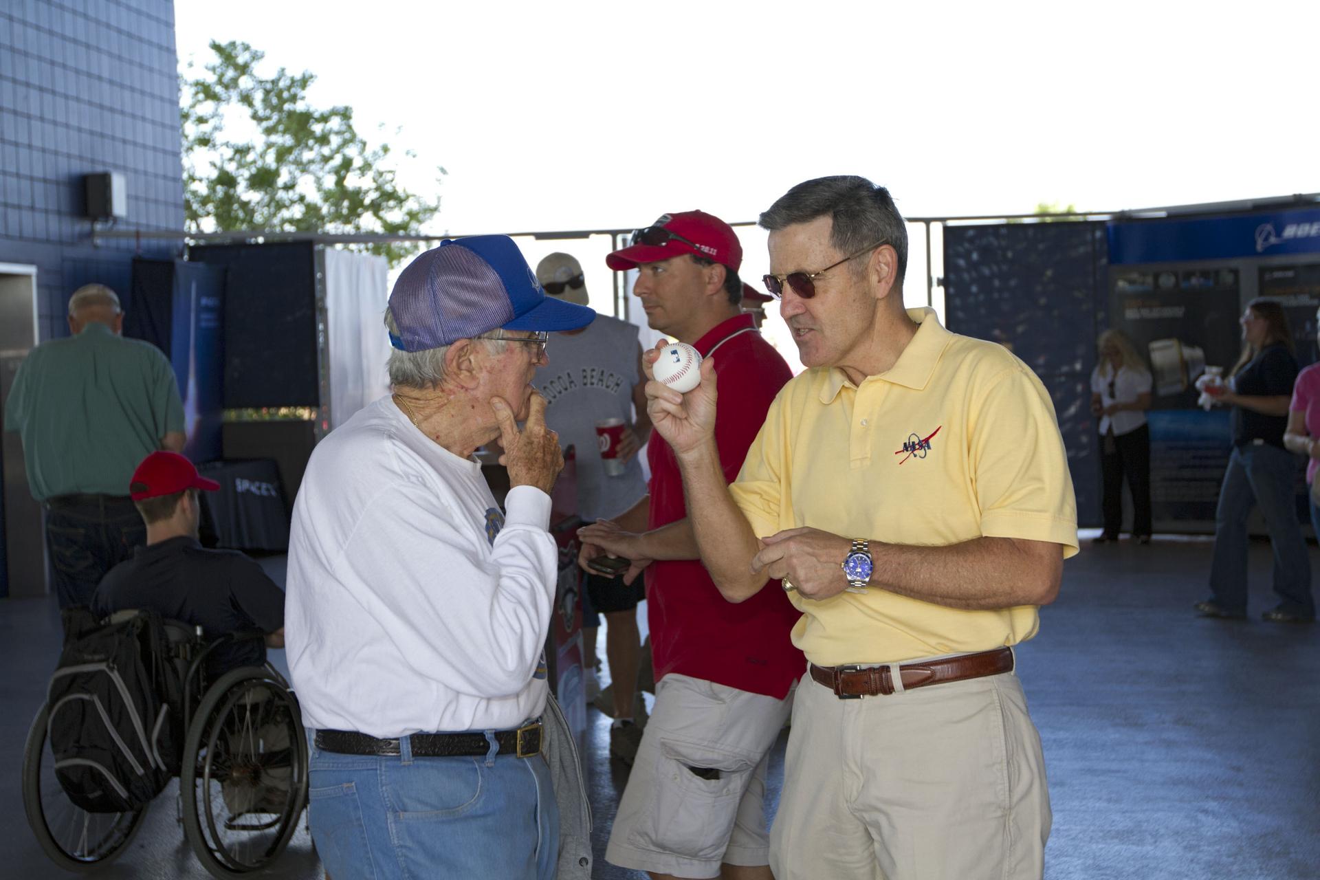 VIERA, Fla. – Bob Cabana, right, director of NASA’s Kennedy Space Center, shows a baseball fan the ball he will use to make the first pitch of a spring training game between Major League Baseball's Washington Nationals and the Houston Astros at the Space Coast Stadium’s Space Day. Kennedy set up a booth at the stadium for the occasion to highlight some of the contributions the space agency has made to sports, transportation and everyday life. A full-scale test version of NASA's new Orion Multi-Purpose Crew Vehicle also was located outside the stadium to show the public the spacecraft under development that will take astronauts farther into space than ever before. For more information, visit http://www.nasa.gov/kennedy. Photo credit: NASA/Kim Shiflett