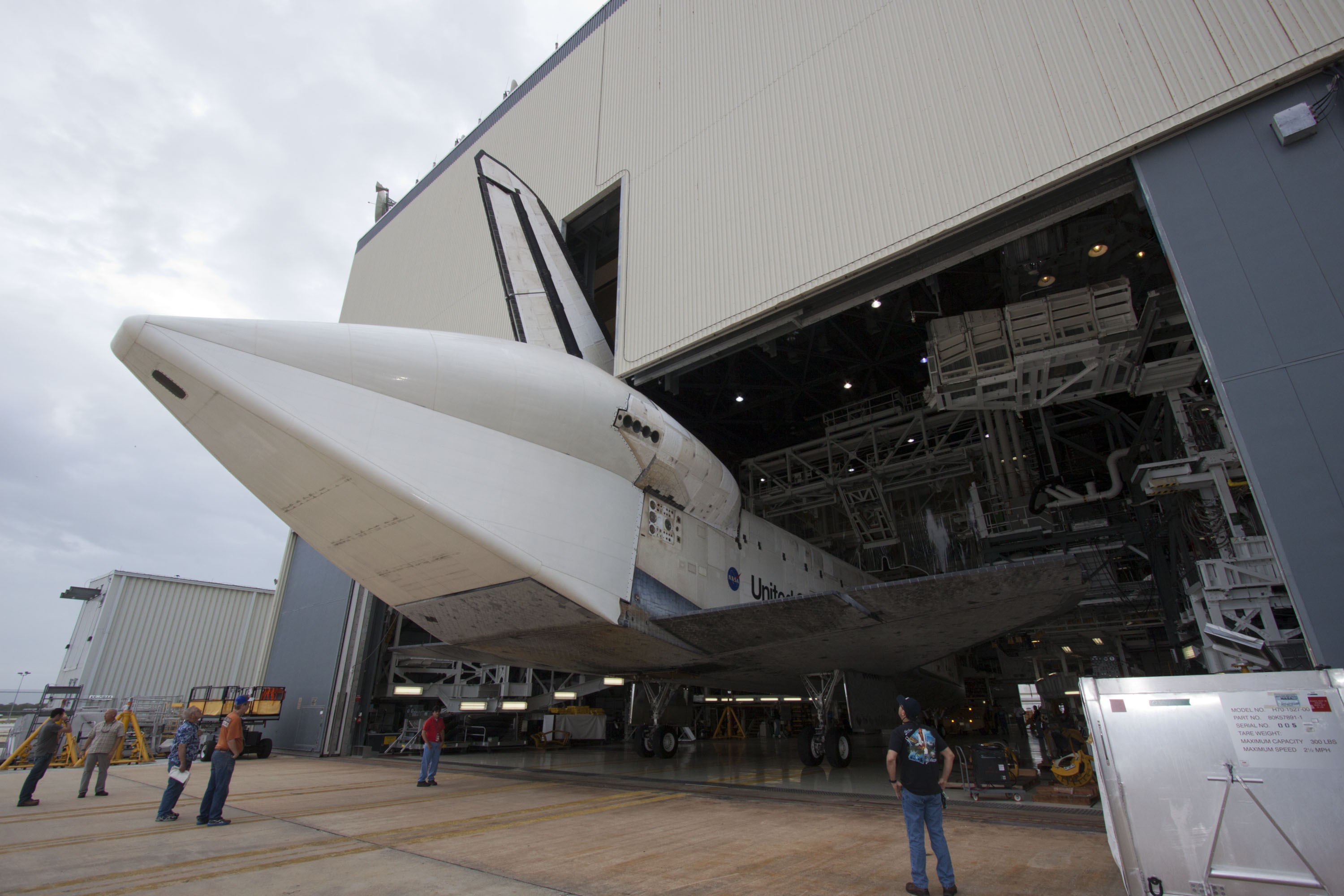 CAPE CANAVERAL, Fla. – At NASA’s Kennedy Space Center in Florida, space shuttle Discovery is backed out of Orbiter Processing Facility-1 for its move to the Vehicle Assembly Building VAB. The aft view of Discovery reveals the tail cone that covers the three replica shuttle main engines. The work is part of the Space Shuttle Program’s transition and retirement processing of shuttle Discovery, which is being prepared for display at Smithsonian’s National Air and Space Museum, Steven F. Udvar-Hazy Center in Chantilly, Va. Discovery will remain in high bay 4 of the VAB until its scheduled transport atop a NASA Shuttle Carrier Aircraft modified 747 jet to Dulles International Airport in Virginia on April 17. Discovery will then be transported to the Smithsonian on April 19. For more information, visit http://www.nasa.gov/shuttle. Photo credit: NASA/Jim Grossmann
