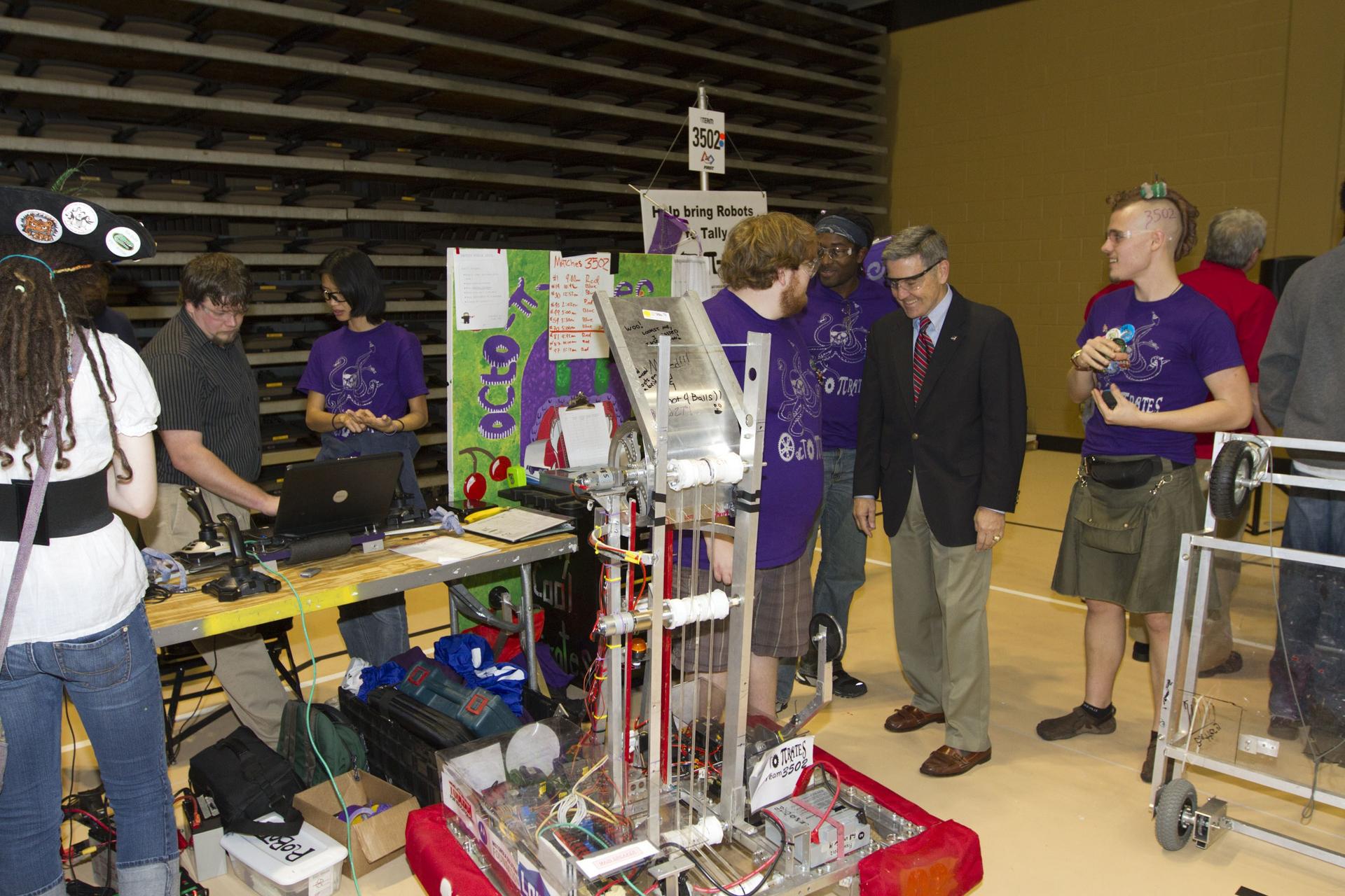 ORLANDO, Fla. -- NASA Kennedy Space Center Director Bob Cabana talks with members of Team 3502, called "The Octo Pie-Rates," which is participating in the regional FIRST robotics competition at the University of Central Florida in Orlando, Fla. The team is made up of students from the School for Arts and Innovative Learning SAIL High School in Tallahassee. More than 60 high school teams took part in the competition called "For Inspiration and Recognition of Science and Technology," or FIRST, in hopes of advancing to the national robotics championship. This year, the competition resembled a basketball game and was dubbed "Rebound Rumble." The game measured the effectiveness of each robot, the power of collaboration and the determination of the teams. FIRST, founded in 1989, is a non-profit organization that designs accessible, innovative programs to build self-confidence, knowledge and life skills while motivating young people to pursue academic opportunities. The robotics competition challenges teams of high school students and their mentors to solve a common problem in a six-week timeframe using a standard kit of parts and a common set of rules. NASA is the largest sponsor of the international program. Kennedy Space Center is a sponsor of the regional event. For more information on Kennedy's education events and initiatives, go to http://www.nasa.gov/offices/education/centers/kennedy/home/index.html. Photo credit: NASA/Kim Shiflett