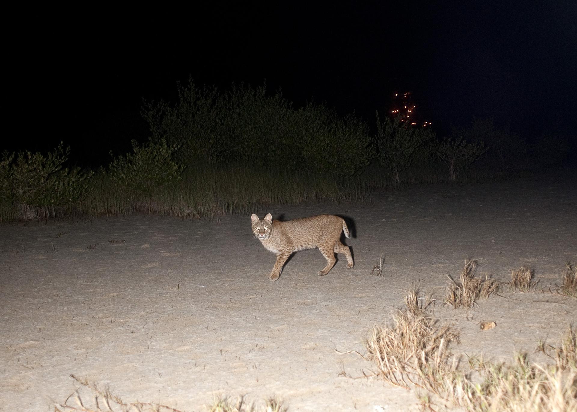 CAPE CANAVERAL, Fla. – Gotcha! A bobcat out on a nocturnal stroll triggers a motion-activated remote camera set up for this purpose at NASA’s Kennedy Space Center in Florida. The cat is seldom observed during the day unless scared from its daytime shelter. It is the last large mammalian predator remaining on the center. In the background are the lights on Launch Pad 39A. Kennedy and the Merritt Island National Wildlife Refuge mutually reside on 140,000 acres on central Florida’s east coast. The area’s coastal dunes, saltwater estuaries and marshes, freshwater impoundments, scrub, pine flatwoods, and hardwood hammocks provide habitats for more than 1,500 species of plants and animals, including about 331 species of birds. For more information, visit http://www.nasa.gov/kennedy. Photo credit: NASA/Tony Gray
