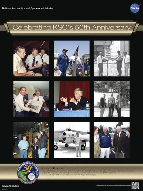 Center Directors: Kennedy Space Center Directors around KSC – 1st row, left to right, Richard Smith [center] Bob Cabana [at the podium] Jay Honeycutt [far right]. 2nd row, left to right, Bob Crippen [left] Jim Kennedy Lieutenant General Forrest S. McCartney, USAF, ret. [far left]. 3rd row, left to right, Bill Parsons [far right] Lee Scherer Roy Bridges [2nd from right]. Poster designed by Kennedy Space Center Graphics Department/Greg Lee. Credit: NASA