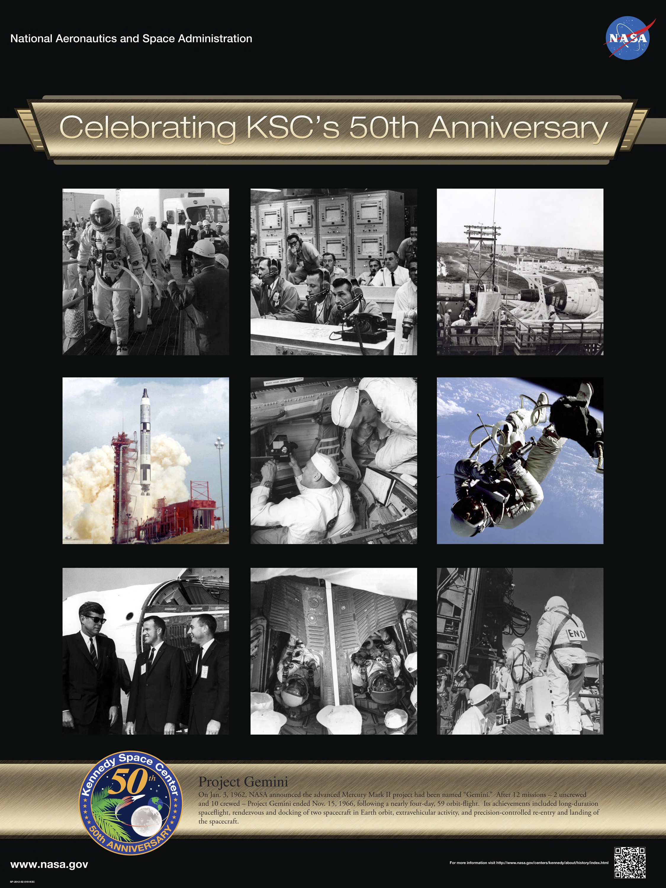 Project Gemini: On Jan. 3, 1962, NASA announced the advanced Mercury Mark II project had been named "Gemini." After 12 missions – 2 uncrewed and 10 crewed – Project Gemini ended Nov. 15, 1966, following a nearly four-day, 59 orbit-flight. Its achievements included long-duration spaceflight, rendezvous and docking of two spacecraft in Earth orbit, extravehicular activity, and precision-controlled re-entry and landing of the spacecraft. Poster designed by Kennedy Space Center Graphics Department/Greg Lee. Credit: NASA