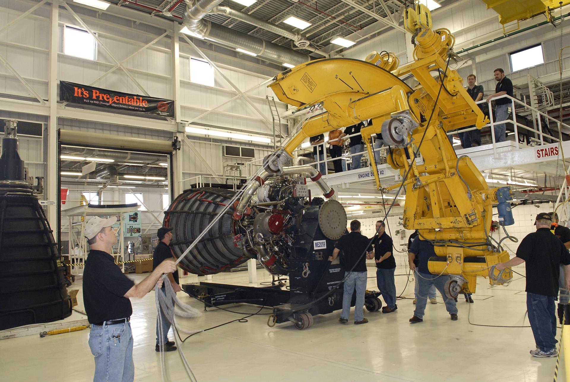 CAPE CANAVERAL, Fla. – A crane moves the engine-handling device away from the Pratt and Whitney Rocketdyne space shuttle main engine, or SSME, that it rotated into a horizontal position inside the SSME Processing Facility, the engine shop at NASA’s Kennedy Space Center in Florida. The engine is secured on a portable workstand before being transferred into a transportation canister. The engine is one of the last SSMEs remaining at Kennedy and is being prepared for shipment to NASA's Stennis Space Center in Mississippi. The first two groups of engines were shipped from Kennedy to Stennis in November 2011 and January 2012 the remaining engines are scheduled to depart on April 9. Altogether, 15 shuttle-era engines will be stored at Stennis for reuse on NASA’s Space Launch System heavy-lift rocket, under development. Photo credit: NASA/Tim Jacobs