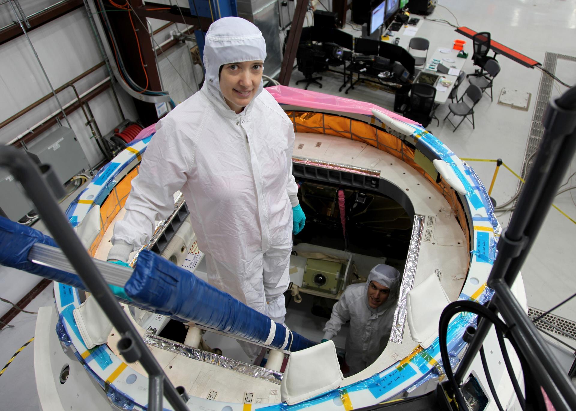 CAPE CANAVERAL, Fla. -- NASA astronaut Megan McArthur, foreground, takes part in a crew equipment interface test CEIT in order to become familiar with the Space Exploration Technologies Corp. SpaceX Dragon capsule prior to its scheduled April 30 liftoff. The interface test inside a processing hangar at Cape Canaveral Air Force Station's Space Launch Complex-40 was part of prelaunch preparations for the company's next demonstration test flight for NASA's Commercial Orbital Transportation Services COTS program. Under COTS, NASA has partnered with two private companies to launch cargo safely to the International Space Station. Jason Tenenbaum, with SpaceX Mission Operations, background, also takes part in the test. CEIT is an activity that dates back to NASA's Space Shuttle Program, providing astronauts on Earth an opportunity to work with the actual hardware they would use in space. This exercise gave astronauts and engineers the opportunity to assess the compatibility of the equipment and systems aboard Dragon with the procedures to be used by the flight crew and flight controllers once the capsule is berthed at the space station. For more information, visit www.nasa.gov/exploration/commercial/cargo/spacex_index.html. Image courtesy: SpaceX/Paul Bonness