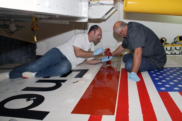 CAPE CANAVERAL, Fla. – Jeremy Schwarz, left, quality assurance technician, and Mike Williams, right, a thermal protection system technician, both with United Space Alliance, apply adhesive to space shuttle Endeavour's right wing. The work is being done in preparation for tile bonding. Endeavour is inside Orbiter Processing Facility-2 at NASA's Kennedy Space Center in Florida. Ongoing transition and retirement activities are preparing the spacecraft for public display at the California Science Center in Los Angeles. Endeavour flew 25 missions during its 19-year career. Photo credit: NASA/Cory Huston
