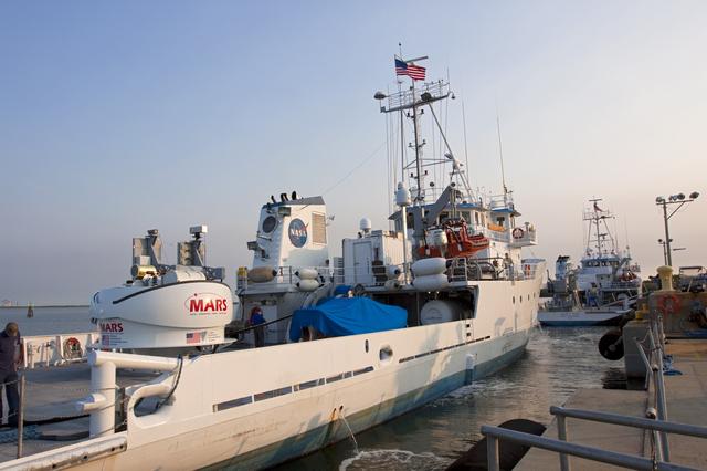 CAPE CANAVERAL, Fla. -- NASA’s Mobile Aerospace Reconnaissance System, or MARS, is secured aboard NASA’s Freedom Star boat near Hangar AE at Cape Canaveral Air Force Station in Florida. MARS is being prepared for a day of testing after departing from Port Canaveral out to the Atlantic Ocean. MARS, run by NASA’s Langley Research Center in Hampton, Va., with its spatial, hyperspectral, thermal, and directed energy capabilities will be used for thermal imaging testing for the upcoming SpaceX Falcon 9 and Dragon capsule test flight to the International Space Station. During today’s test, the MARS X-band radar and kineto tracking mount KTM were tested to ensure that they were synchronized to receive a rocket launch feed. The radar was used to identify an object to see if the KTM could lock on to and track it. The MARS team performed maintenance on the system, confirmed communications links, and tested the design of the mounting system and environmental enclosure. Photo credit: NASA/Jim Grossmann