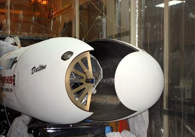 VANDENBERG AIR FORCE BASE, Calif. – The Pegasus payload fairing has been opened to reveal NASA’s Nuclear Spectroscopic Telescope Array, or NuSTAR, in Orbital Sciences’ hangar on Vandenberg Air Force Base in California. Access to the spacecraft is needed for compatibility testing to verify communication with a tracking station in Hawaii. With the change in the launch timeframe to June, this station will be needed to support launch. After processing of Orbital’s Pegasus XL rocket and the spacecraft are complete, they will be flown on Orbital's L-1011 carrier aircraft from Vandenberg to the Ronald Reagan Ballistic Missile Defense Test Site on the Pacific Ocean’s Kwajalein Atoll for launch. The high-energy X-ray telescope will conduct a census of black holes, map radioactive material in young supernovae remnants, and study the origins of cosmic rays and the extreme physics around collapsed stars. For more information, visit http://www.nasa.gov/nustar. Photo credit: NASA/Randy Beaudoin, VAFB