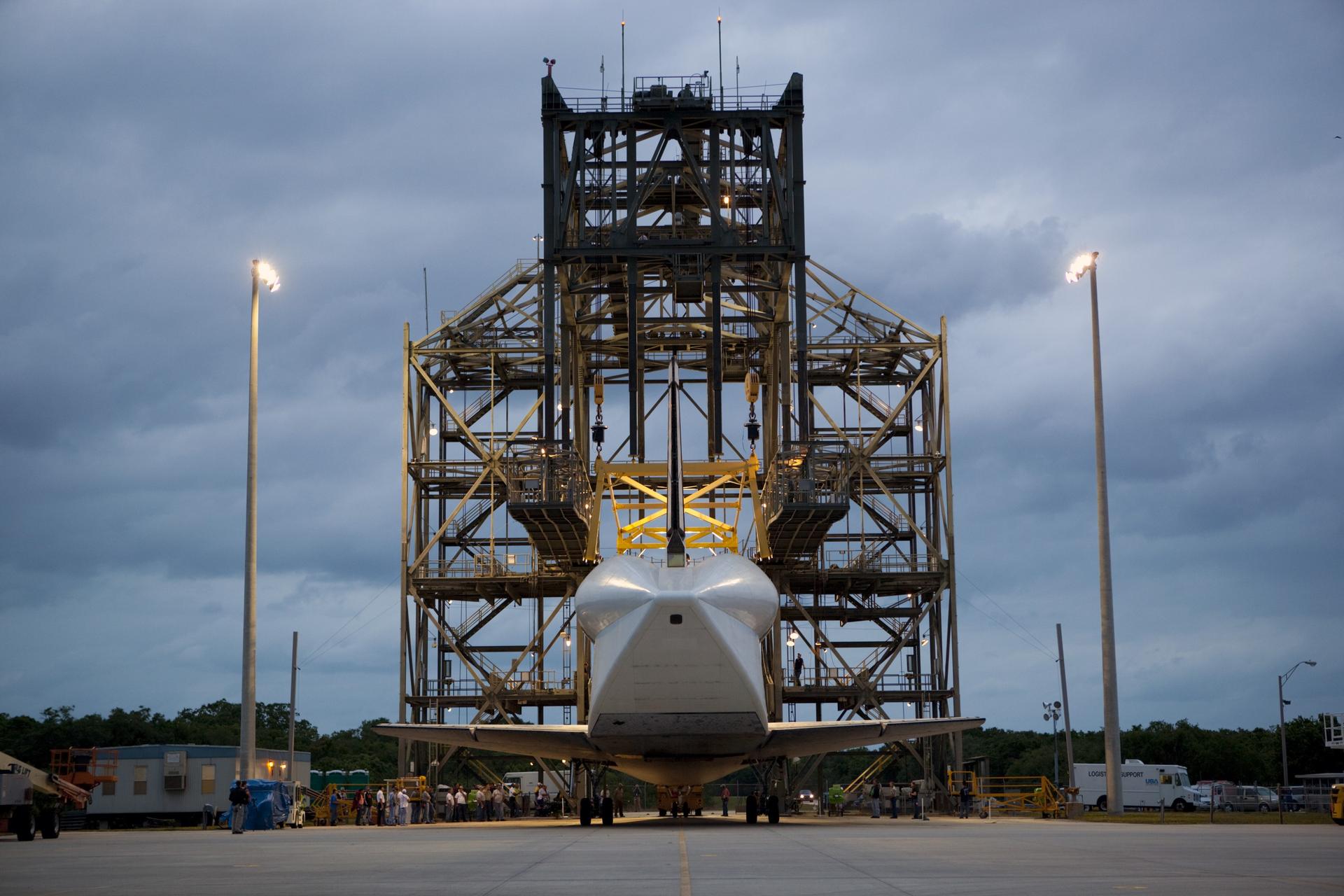 CAPE CANAVERAL, Fla. – Space shuttle Discovery rolls into position beneath the mate-demate device, or MDD, at the Shuttle Landing Facility, or SLF, at NASA’s Kennedy Space Center in Florida. A tail cone has been installed over its three replica shuttle main engines to reduce aerodynamic drag and turbulence during its upcoming ferry flight. The MDD is a large gantry-like steel structure used to hoist a shuttle off the ground and position it onto the back of a Shuttle Carrier Aircraft, or SCA. The SCA is a Boeing 747 jet, originally manufactured for commercial use, which was modified by NASA to transport the shuttles between destinations on Earth. The SCA designated NASA 905 is assigned to the remaining ferry missions, delivering the shuttles to their permanent public display sites. Discovery’s new home will be the Smithsonian's National Air and Space Museum Steven F. Udvar-Hazy Center in Chantilly, Va. For more information on the SCA, visit http://www.nasa.gov/centers/dryden/news/FactSheets/FS-013-DFRC.html. For more information on shuttle transition and retirement activities, visit http://www.nasa.gov/transition. Photo credit: NASA/Dimitri Gerondidakis
