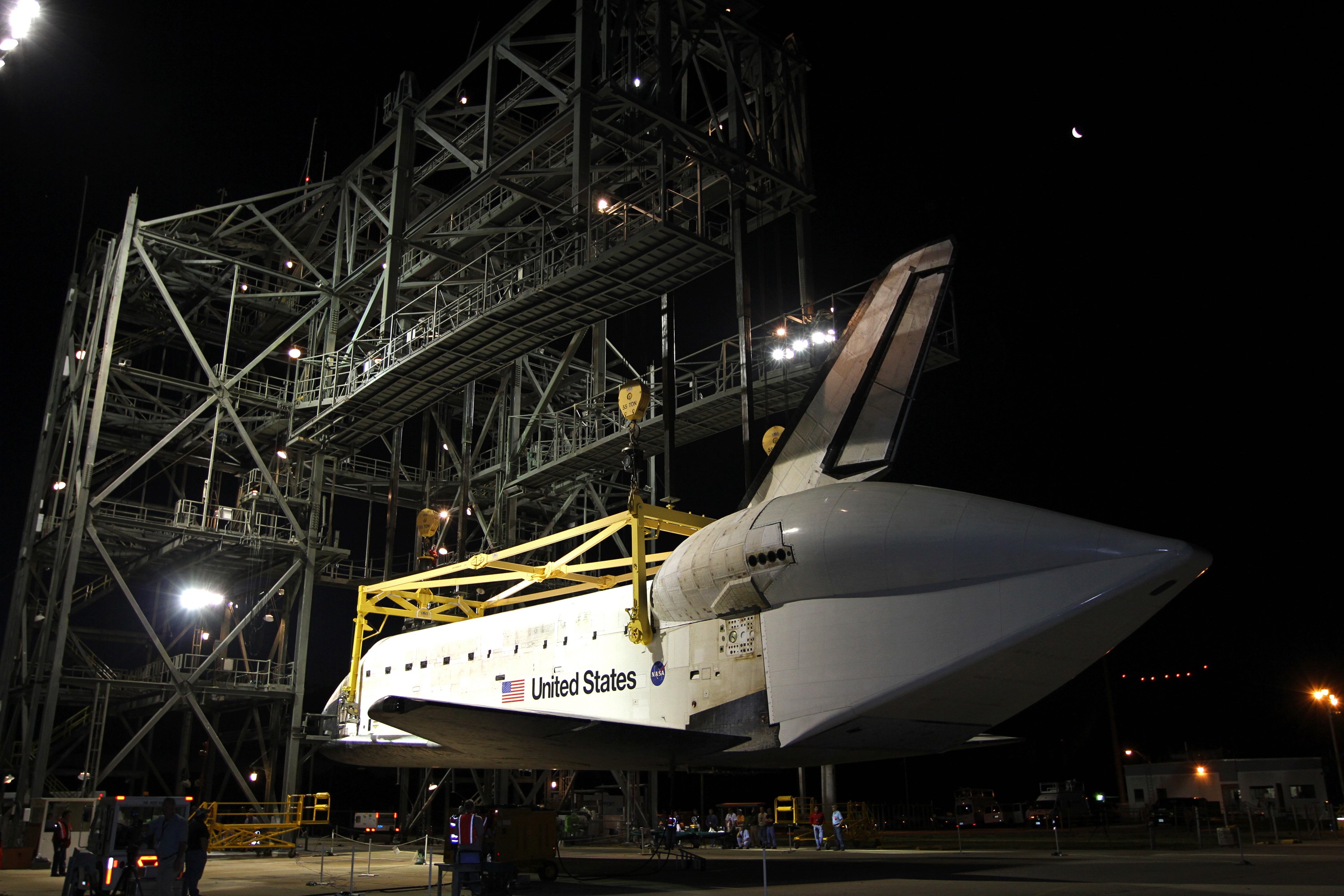 CAPE CANAVERAL, Fla. – Before sunrise at the Shuttle Landing Facility at NASA’s Kennedy Space Center in Florida, space shuttle Discovery is lifted into the mate-demate device by a crane hooked to the yellow sling. Operations have resumed to place Discovery on top of a Shuttle Carrier Aircraft in preparation for its departure from Kennedy on Tuesday. A tail cone has been installed over Discovery’s three replica shuttle main engines to reduce aerodynamic drag and turbulence during the ferry flight. The device, known as the MDD, is a large gantry-like steel structure used to hoist a shuttle off the ground and position it onto the back of the aircraft, or SCA. The SCA is a Boeing 747 jet, originally manufactured for commercial use, which was modified by NASA to transport the shuttles between destinations on Earth. The SCA designated NASA 905 is assigned to the remaining ferry missions, delivering the shuttles to their permanent public display sites. NASA 905 is scheduled to ferry Discovery to the Washington Dulles International Airport in Virginia on April 17, after which the shuttle will be placed on display in the Smithsonian's National Air and Space Museum Steven F. Udvar-Hazy Center. For more information on the SCA, visit http://www.nasa.gov/centers/dryden/news/FactSheets/FS-013-DFRC.html. For more information on shuttle transition and retirement activities, visit http://www.nasa.gov/transition. Photo credit: NASA/Kim Shiflett