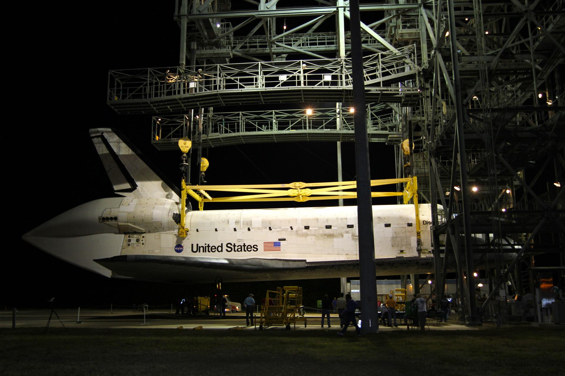 CAPE CANAVERAL, Fla. – Before sunrise at the Shuttle Landing Facility at NASA’s Kennedy Space Center in Florida, lights on the mate-demate device reveal space shuttle Discovery suspended above the ground. Operations are under way to place Discovery on top of a Shuttle Carrier Aircraft in preparation for its departure from Kennedy on Tuesday. A tail cone has been installed over Discovery’s three replica shuttle main engines to reduce aerodynamic drag and turbulence during the ferry flight. The device, known as the MDD, is a large gantry-like steel structure used to hoist a shuttle off the ground and position it onto the back of the aircraft, or SCA. The SCA is a Boeing 747 jet, originally manufactured for commercial use, which was modified by NASA to transport the shuttles between destinations on Earth. The SCA designated NASA 905 is assigned to the remaining ferry missions, delivering the shuttles to their permanent public display sites. NASA 905 is scheduled to ferry Discovery to the Washington Dulles International Airport in Virginia on April 17, after which the shuttle will be placed on display in the Smithsonian's National Air and Space Museum Steven F. Udvar-Hazy Center. For more information on the SCA, visit http://www.nasa.gov/centers/dryden/news/FactSheets/FS-013-DFRC.html. For more information on shuttle transition and retirement activities, visit http://www.nasa.gov/transition. Photo credit: NASA/Kim Shiflett