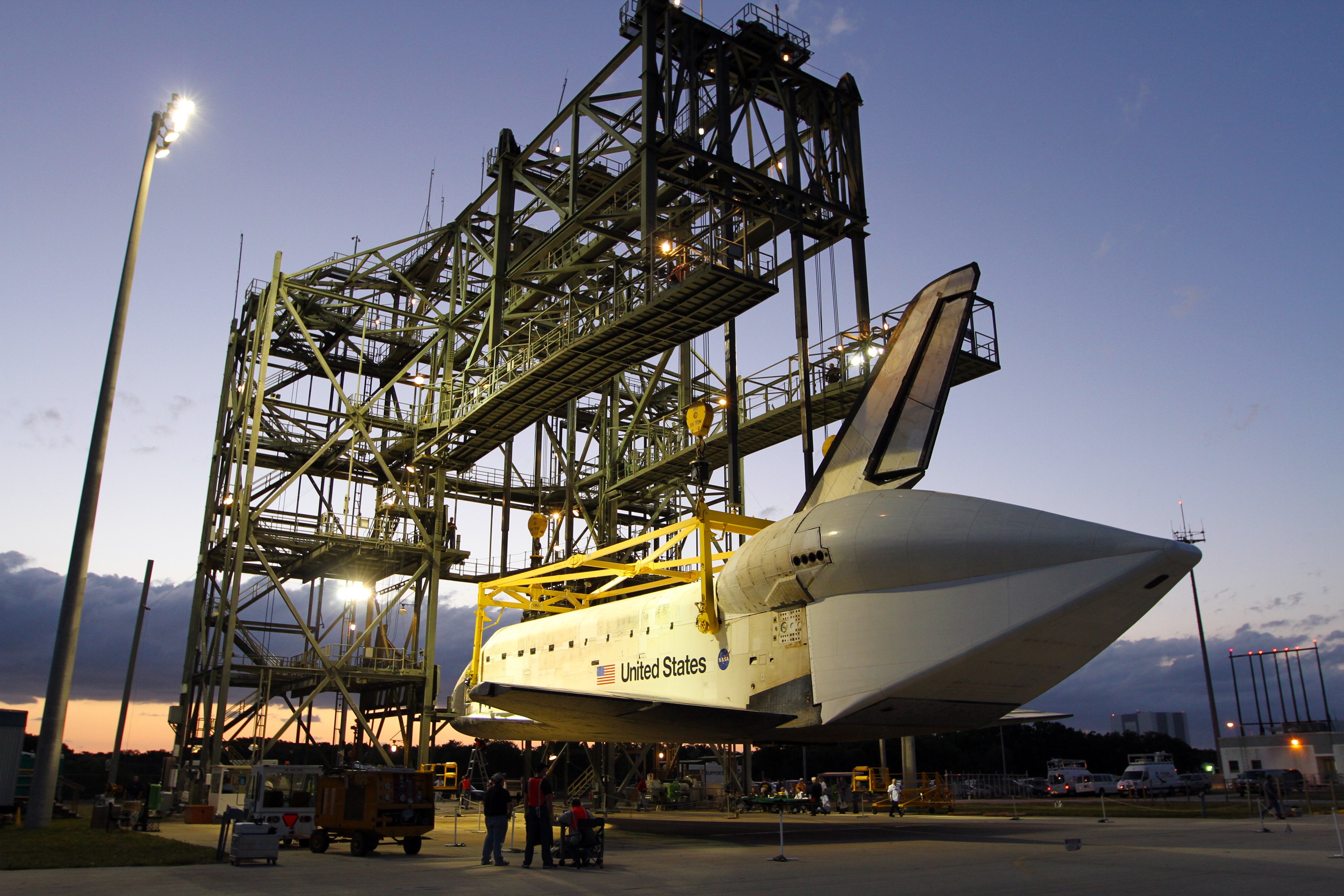 CAPE CANAVERAL, Fla. – As the sun rises over the Shuttle Landing Facility at NASA’s Kennedy Space Center in Florida, operations are under way at the mate-demate device to lift space shuttle Discovery on top of a Shuttle Carrier Aircraft in preparation for its departure from Kennedy on Tuesday. A tail cone has been installed over Discovery’s three replica shuttle main engines to reduce aerodynamic drag and turbulence during the ferry flight. The device, known as the MDD, is a large gantry-like steel structure used to hoist a shuttle off the ground and position it onto the back of the aircraft, or SCA. The SCA is a Boeing 747 jet, originally manufactured for commercial use, which was modified by NASA to transport the shuttles between destinations on Earth. The SCA designated NASA 905 is assigned to the remaining ferry missions, delivering the shuttles to their permanent public display sites. NASA 905 is scheduled to ferry Discovery to the Washington Dulles International Airport in Virginia on April 17, after which the shuttle will be placed on display in the Smithsonian's National Air and Space Museum Steven F. Udvar-Hazy Center. For more information on the SCA, visit http://www.nasa.gov/centers/dryden/news/FactSheets/FS-013-DFRC.html. For more information on shuttle transition and retirement activities, visit http://www.nasa.gov/transition. Photo credit: NASA/Kim Shiflett