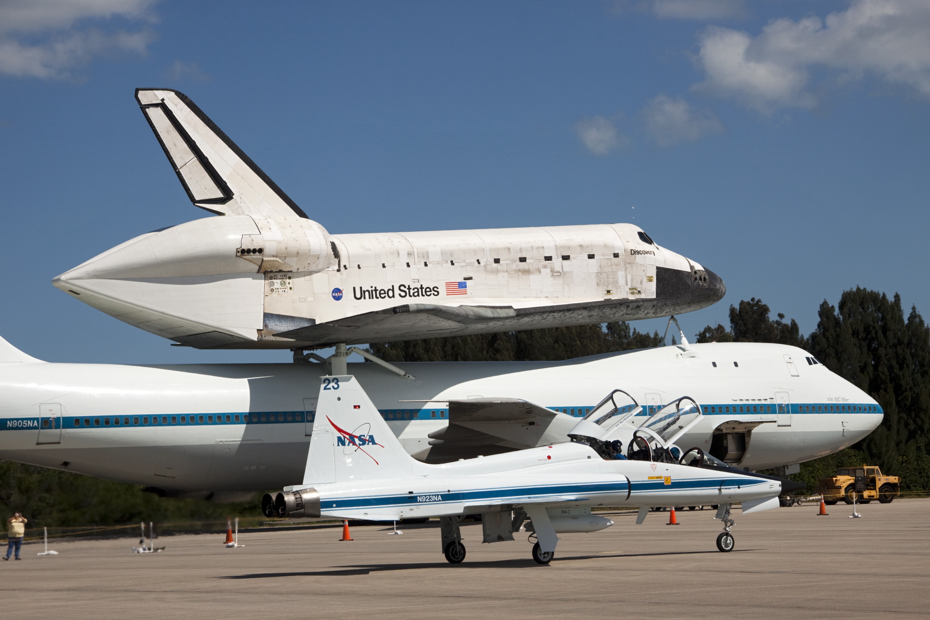 CAPE CANAVERAL, Fla. – A T-38 jet parks beside space shuttle Discovery secured atop a Shuttle Carrier Aircraft on the tarmac of the Shuttle Landing Facility at NASA’s Kennedy Space Center in Florida. Astronauts are arriving to participate in the festivities related to the final departure of Discovery from Kennedy. The carrier aircraft, also known as an SCA, is a Boeing 747 jet, originally manufactured for commercial use which was modified by NASA to transport the shuttles between destinations on Earth. NASA 905 is scheduled to ferry Discovery to the Washington Dulles International Airport in Virginia on April 17, and is assigned to all remaining ferry missions, delivering the shuttles to their permanent public display sites. After its arrival at Dulles, Discovery will be placed on display in the Smithsonian's National Air and Space Museum Steven F. Udvar-Hazy Center on April 19. For more information on the SCA, visit http://www.nasa.gov/centers/dryden/news/FactSheets/FS-013-DFRC.html. For more information on shuttle transition and retirement activities, visit http://www.nasa.gov/transition. Photo credit: NASA/Amanda Diller