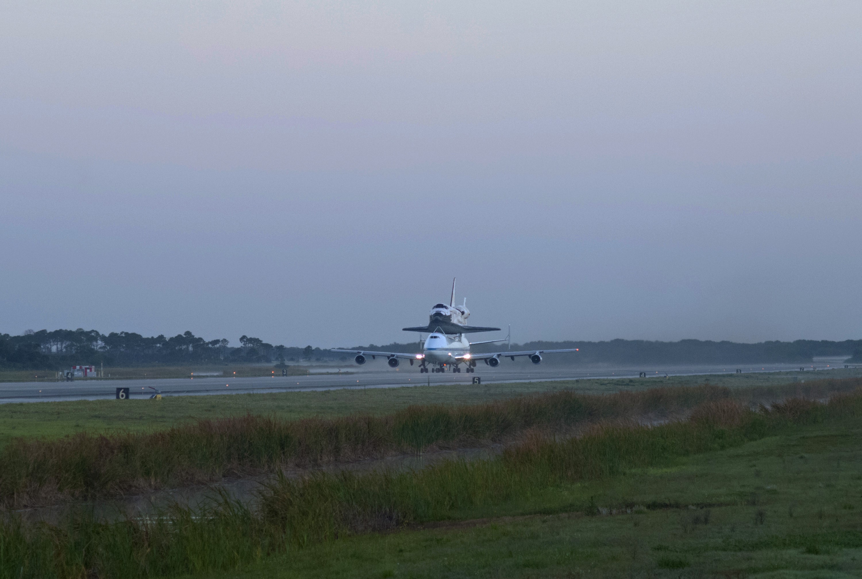 CAPE CANAVERAL, Fla. – Sunrise over the Shuttle Landing Facility at NASA’s Kennedy Space Center in Florida reveals the Shuttle Carrier Aircraft that is transporting space shuttle Discovery to its new home preparing for takeoff. The aircraft, known as an SCA, is a Boeing 747 jet, originally manufactured for commercial use, which was modified by NASA to transport the shuttles between destinations on Earth. This SCA, designated NASA 905, is assigned to the remaining ferry missions, delivering the shuttles to their permanent public display sites. NASA 905 is scheduled to ferry Discovery to the Washington Dulles International Airport in Virginia on April 17, after which the shuttle will be placed on display in the Smithsonian's National Air and Space Museum Steven F. Udvar-Hazy Center. For more information on the SCA, visit http://www.nasa.gov/centers/dryden/news/FactSheets/FS-013-DFRC.html. For more information on shuttle transition and retirement activities, visit http://www.nasa.gov/transition. Photo credit: NASA/Rusty Backer