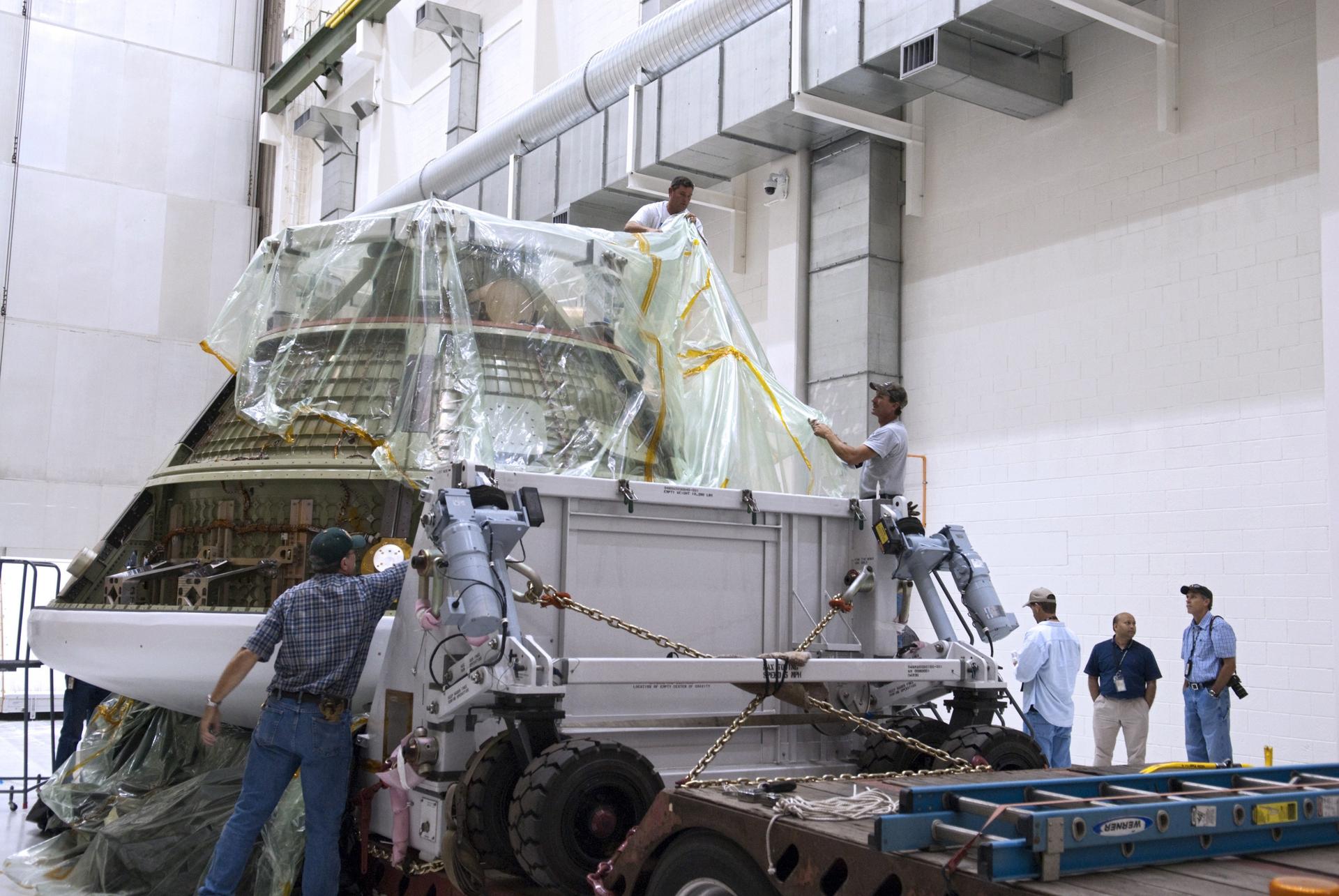 CAPE CANAVERAL, Fla. -- Lockheed Martin crews unpack the Orion ground test vehicle in the Operations and Checkout O&C Facility at NASA's Kennedy Space Center in Florida. The vehicle traveled more than 1,800 miles from the company's Waterton Facility near Denver where it successfully completed a series of rigorous tests that simulated launch and spaceflight environments. The ground test vehicle will be used for pathfinding operations in the O&C, including simulated manufacturing and assembly procedures. After those operations are completed, new backshell panels will be installed on the ground test vehicle at the O&C prior to the vehicle’s trek to NASA's Langley Research Center in Virginia for splashdown testing at the agency's Hydro Impact Basin. Launching atop NASA's heavy-lift Space Launch System SLS, which also is under development, the Orion Multi-Purpose Crew Vehicle MPCV will serve as the exploration vehicle that will carry astronaut crews beyond low Earth orbit. It also will provide emergency abort capabilities, sustain the crew during space travel and provide safe re-entry from deep space return velocities. For more information, visit www.nasa.gov/orion. Photo credit: Charisse Nahser
