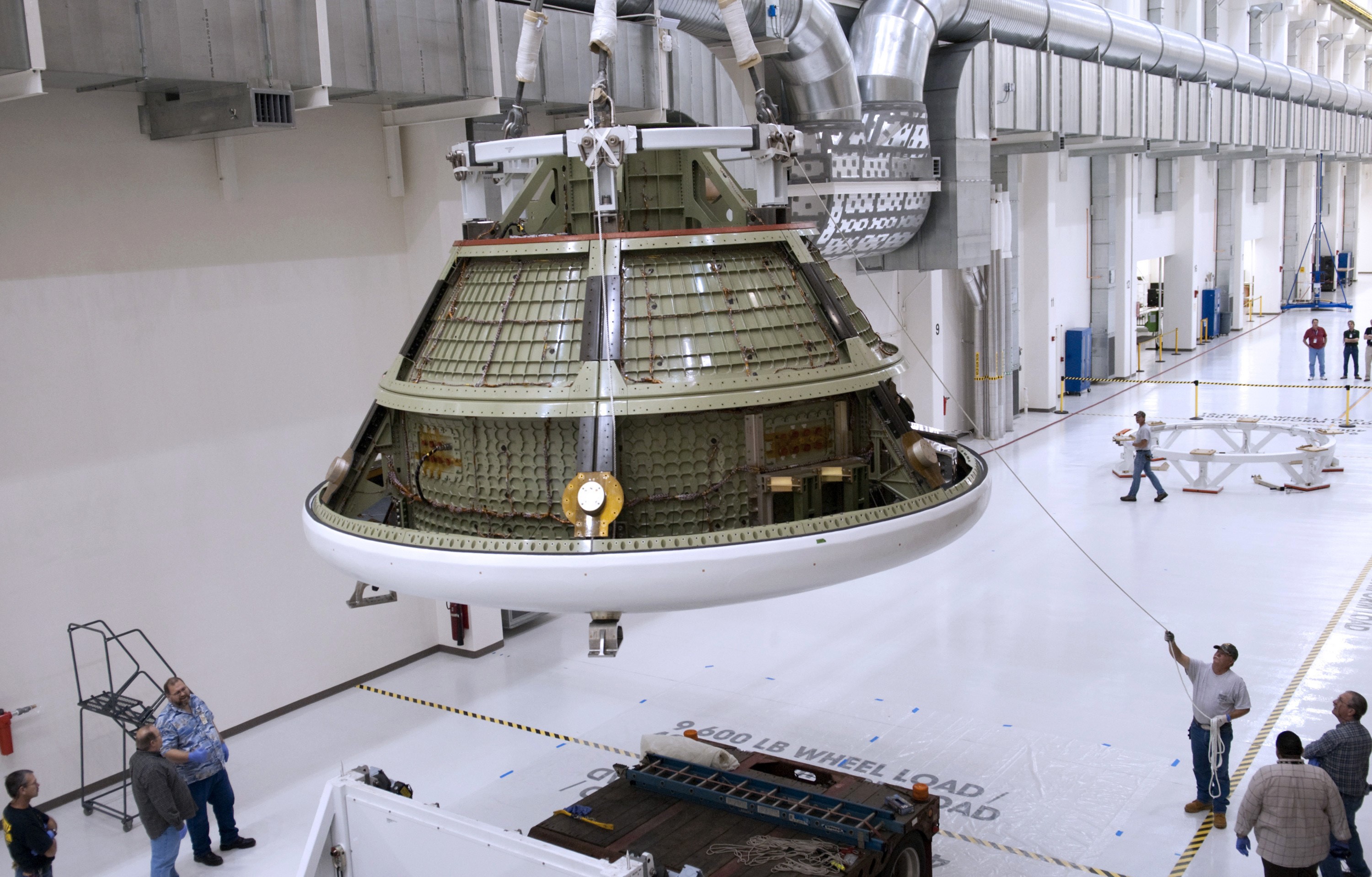 CAPE CANAVERAL, Fla. -- Lockheed Martin crews remove the Orion ground test vehicle from its packaging in the Operations and Checkout O&C Facility at NASA's Kennedy Space Center in Florida. The vehicle traveled more than 1,800 miles from the company's Waterton Facility near Denver where it successfully completed a series of rigorous tests that simulated launch and spaceflight environments. The ground test vehicle will be used for pathfinding operations in the O&C, including simulated manufacturing and assembly procedures. After those operations are completed, new backshell panels will be installed on the ground test vehicle at the O&C prior to the vehicle’s trek to NASA's Langley Research Center in Virginia for splashdown testing at the agency's Hydro Impact Basin. Launching atop NASA's heavy-lift Space Launch System SLS, which also is under development, the Orion Multi-Purpose Crew Vehicle MPCV will serve as the exploration vehicle that will carry astronaut crews beyond low Earth orbit. It also will provide emergency abort capabilities, sustain the crew during space travel and provide safe re-entry from deep space return velocities. For more information, visit www.nasa.gov/orion. Photo credit: Charisse Nahser