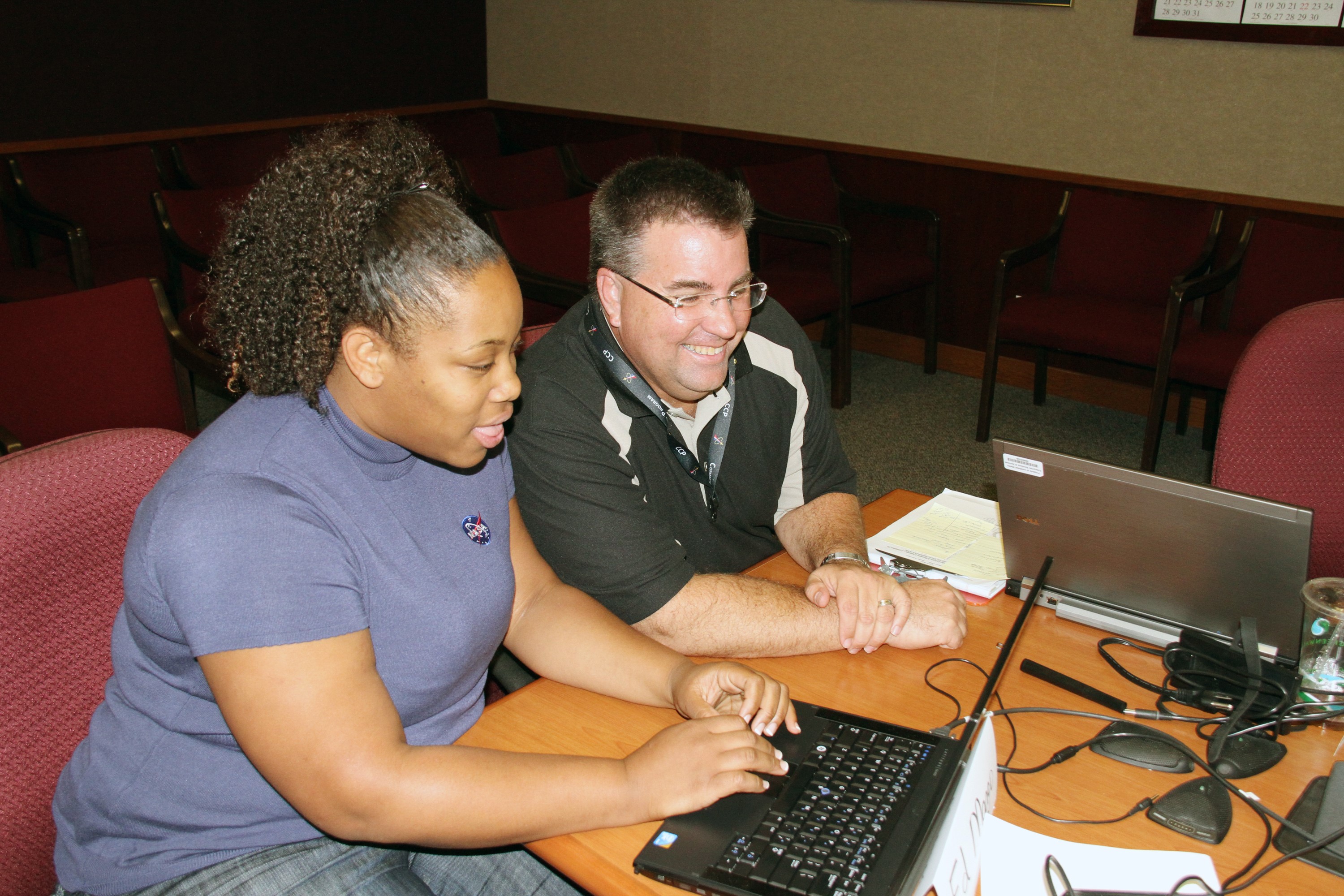 CAPE CANAVERAL, Fla. – The manager of NASA's Commercial Crew Program CCP, Ed Mango, hosts a virtual conversation, called a Tweet Chat, with Twitter followers from around the world. Those who follow www.twitter.com/commercial_crew had an hour-long opportunity to ask Mango questions about NASA’s efforts to get astronauts to low Earth orbit and the International Space Station aboard American rockets and spacecraft. Mango stuck to the social networking service's 140 character limit and answered dozens of questions. At left, is Brittani Sims, a member of the CCP team. The goal of CCP is to drive down the cost of space travel as well as open up space to more people than ever before by balancing industry’s own innovative capabilities with NASA's 50 years of human spaceflight experience. Seven aerospace companies are maturing launch vehicle and spacecraft designs under the program’s second round of development, called Commercial Crew Development Round 2 CCDev2), including Alliant Techsystems Inc. ATK, The Boeing Co., Excalibur Almaz Inc., Blue Origin, Sierra Nevada, Space Exploration Technologies SpaceX, and United Launch Alliance ULA. For more information, visit www.nasa.gov/commercialcrew. Image credit: NASA/Gianni Woods