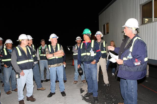 NEW YORK – Technicians review plans for lifting the space shuttle Enterprise from the top of NASA's shuttle carrier aircraft. The work took place at John F. Kennedy International Airport in New York City. Enterprise, a prototype built to test aspects of the space shuttle design, will be displayed at the Intrepid Sea, Air and Space Museum in New York. Photo credit: NASA/Kim Shiflett