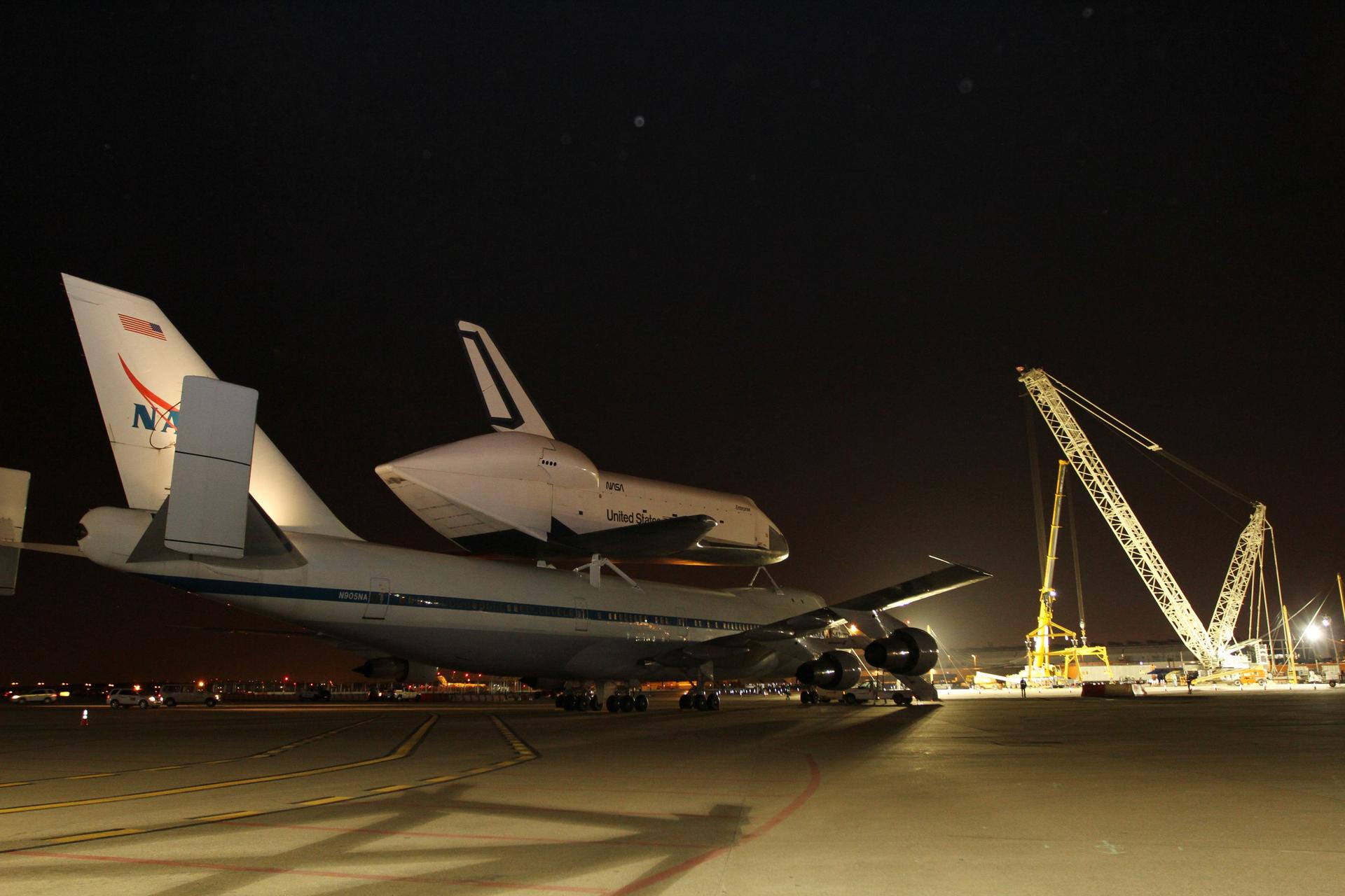 NEW YORK – Cranes and other equipment wait as NASA's shuttle carrier aircraft and space shuttle Enterprise are moved into place so the shuttle can be taken off the top of the aircraft. The work took place at John F. Kennedy International Airport in New York City. Enterprise, a prototype built to test aspects of the space shuttle design, will be displayed at the Intrepid Sea, Air and Space Museum in New York. Photo credit: NASA/Kim Shiflett