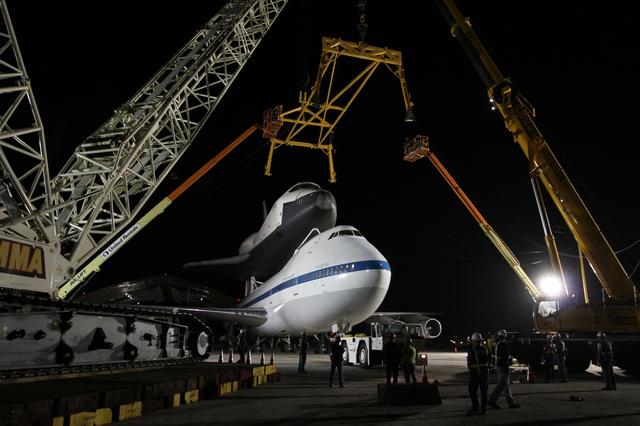 NEW YORK – Cranes and other equipment wait as NASA's shuttle carrier aircraft and space shuttle Enterprise are moved into place so the shuttle can be taken off the top of the aircraft. The work took place at John F. Kennedy International Airport in New York City. Enterprise, a prototype built to test aspects of the space shuttle design, will be displayed at the Intrepid Sea, Air and Space Museum in New York. Photo credit: NASA/Kim Shiflett