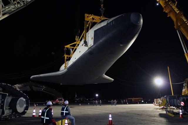 NEW YORK – Space shuttle Enterprise hangs in a specialized sling as a crew continues demate operations for the prototype spacecraft. The work took place at John F. Kennedy International Airport in New York City. Enterprise, a prototype built to test aspects of the space shuttle design, will be displayed at the Intrepid Sea, Air and Space Museum in New York. Photo credit: NASA/Kim Shiflett