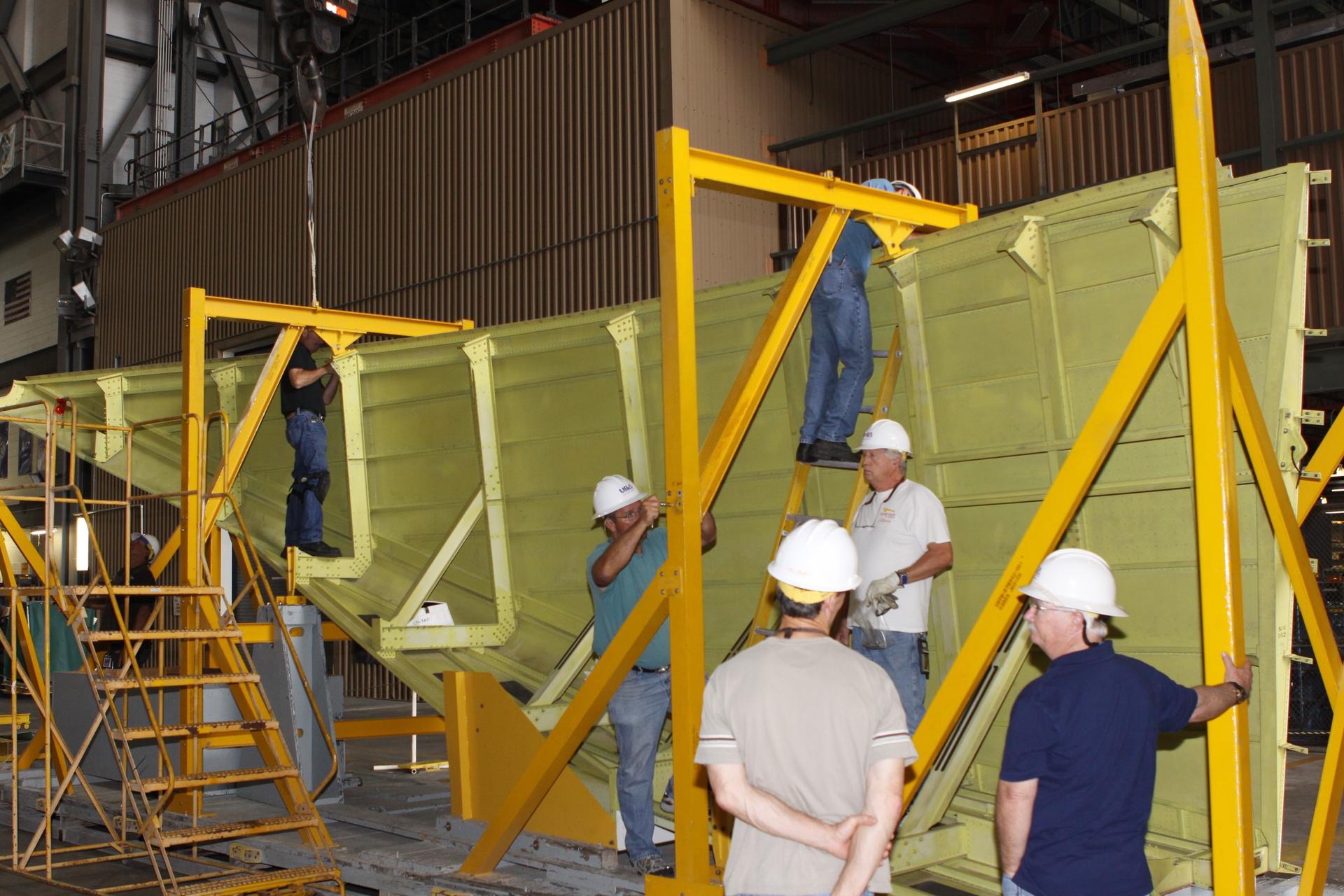 CAPE CANAVERAL, Fla. – Inside the Vehicle Assembly Building at NASA’s Kennedy Space Center in Florida, United Space Alliance technicians prepare the right side tail cone for buildup on space shuttle Endeavour. The tail cone protects space shuttle main engines during ferry flights on top of the Shuttle Carrier Aircraft, or SCA. The work is part of Transition and Retirement of the remaining space shuttles, Endeavour and Atlantis. Endeavour is being prepared for public display at the California Science Center in Los Angeles. Its ferry flight to California is targeted for mid-September. Endeavour was the last space shuttle added to NASA’s orbiter fleet. Over the course of its 19-year career, Endeavour spent 299 days in space during 25 missions. For more information, visit http://www.nasa.gov/shuttle. Photo credit: NASA/Jim Grossmann