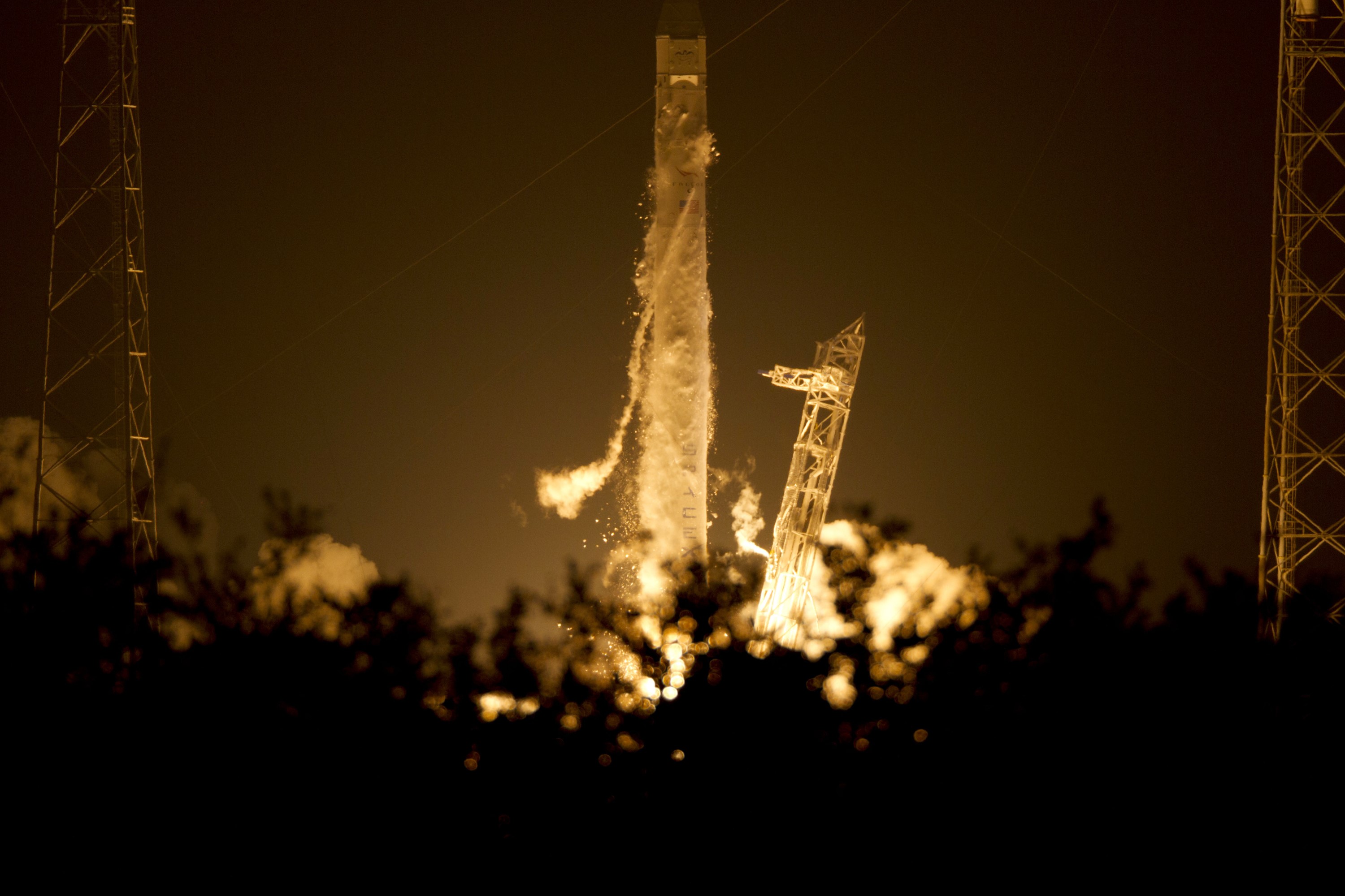 CAPE CANAVERAL, Fla. – Nine Merlin engines ignite under the SpaceX Falcon 9 rocket at 3:44 a.m. EDT at Space Launch Complex-40 on Cape Canaveral Air Force Station in Florida. The launch is the company's second demonstration test flight for NASA's Commercial Orbital Transportation Services, or COTS, Program. During the flight, the Dragon capsule will conduct a series of check-out procedures to test and prove its systems, including rendezvous and berthing with the International Space Station. If the capsule performs as planned, the cargo and experiments it is carrying will be transferred to the station. The cargo includes food, water and provisions for the station’s Expedition crews, such as clothing, batteries and computer equipment. Under COTS, NASA has partnered with two aerospace companies to deliver cargo to the station. For more information, visit http://www.nasa.gov/spacex. Photo credit: NASA/Rick Wetherington, Tim Powers and Tim Terry