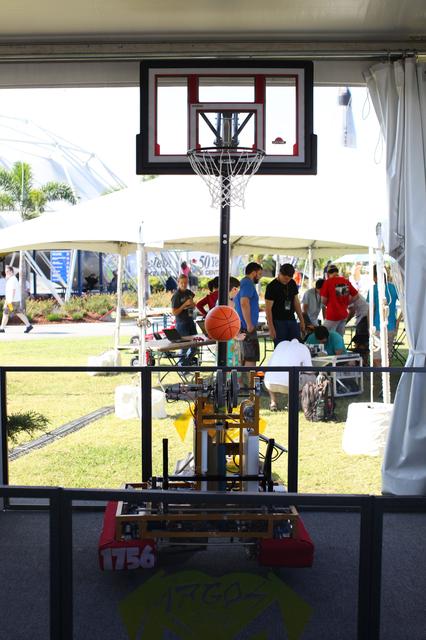 CAPE CANAVERAL, Fla. – At NASA’s Kennedy Space Center Visitor Complex in Florida, the For Inspiration and Recognition of Science and Technology FIRST Argos Team 1756 robot from Limestone Community, Brimfield and Richwoods High Schools in Peoria, Ill., is on display in Caterpillar’s sponsor booth at NASA’s Lunabotics Mining Competition. The mining competition is sponsored by NASA Kennedy Space Center’s Education Office for the agency’s Exploration Systems Mission Directorate. Undergraduate and graduate students from more than 50 universities and colleges in the U.S. and other countries use their remote-controlled Lunabots to maneuver and dig in a supersized sandbox filled with a crushed material that has characteristics similar to lunar soil. For more information, visit www.nasa.gov/lunabotics. Photo credit: NASA/Frankie Martin