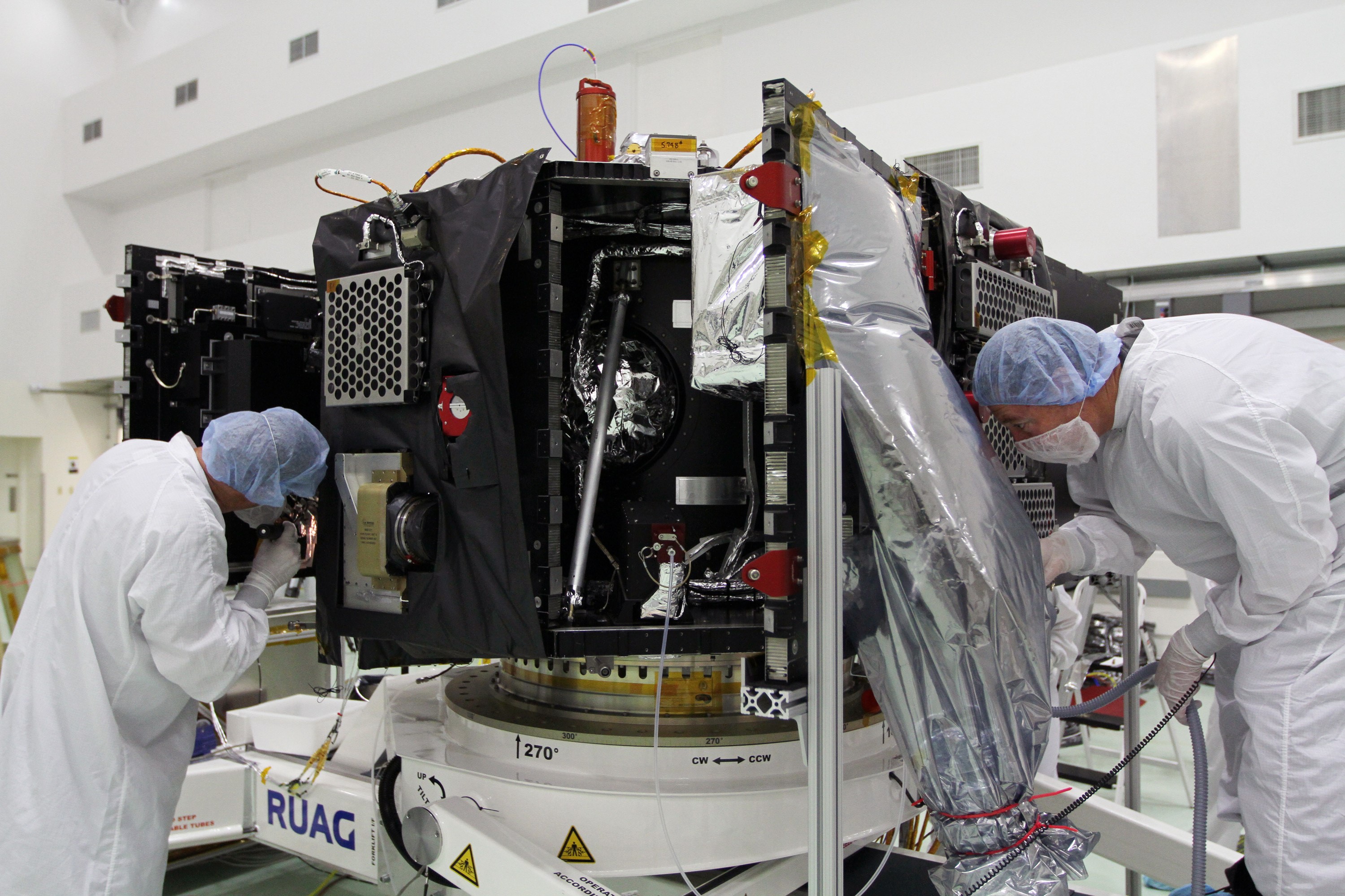 CAPE CANAVERAL, Fla. – Technicians use flashlights to conduct a meticulous inspection of one of NASA's twin Radiation Belt Storm Probes. The spacecraft is secured to a work stand inside the Astrotech payload processing facility near Kennedy Space Center in Florida. The Radiation Belt Storm Probes, or RBSP, mission will help us understand the sun’s influence on Earth and near-Earth space by studying the Earth’s radiation belts on various scales of space and time. RBSP will begin its mission of exploration of Earth's Van Allen radiation belts and the extremes of space weather after its launch aboard a United Launch Alliance Atlas V rocket. For more information, visit http://www.nasa.gov/rbsp. Photo credit: NASA/Kim Shiflett