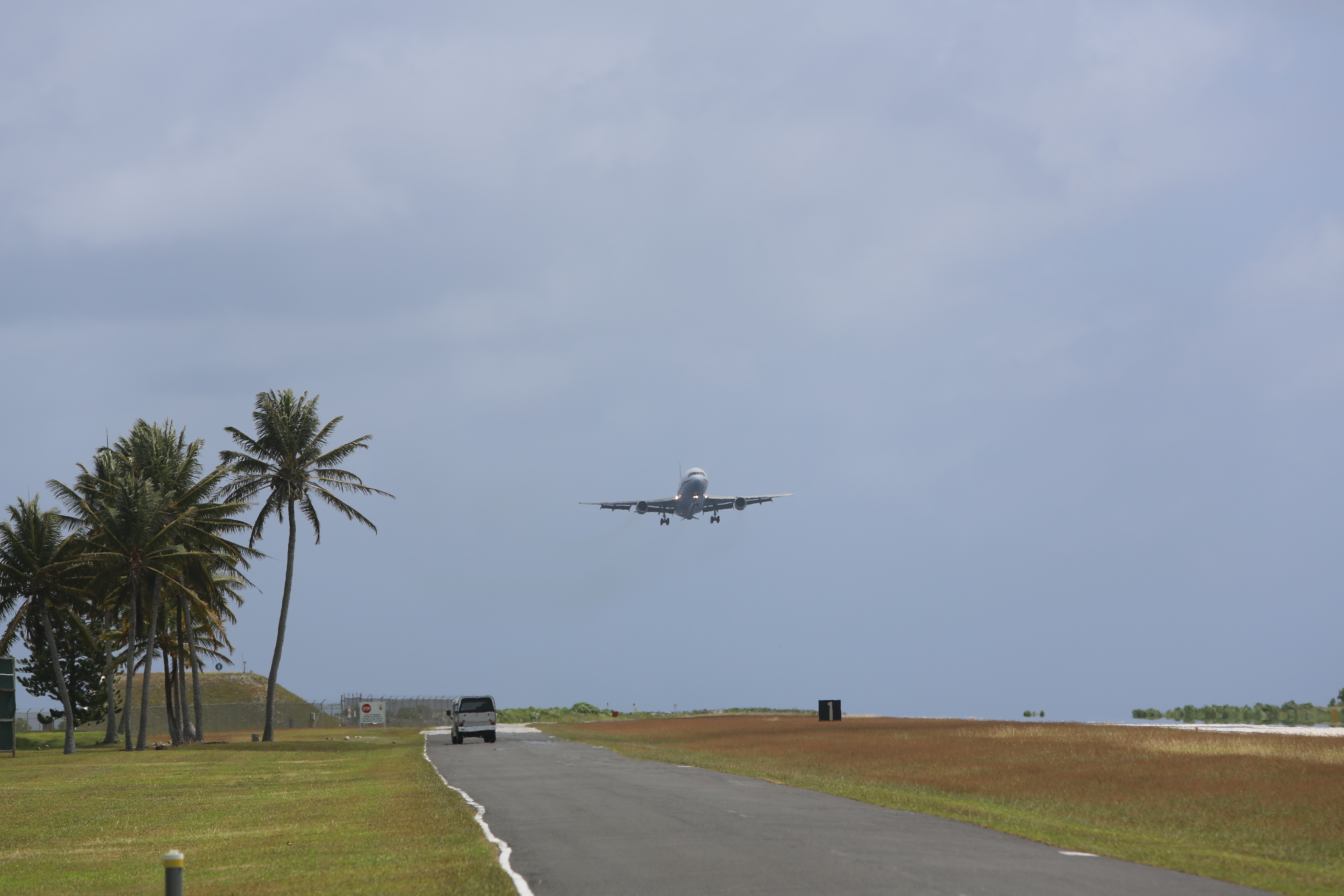 KWAJALEIN ATOLL, Marshall Islands – Orbital Sciences' L-1011 carrier aircraft approaches the runway at the U.S. Army's Ronald Reagan Ballistic Missile Defense Test Site on Kwajalein Atoll to deliver Orbital’s Pegasus rocket and NASA’s Nuclear Spectroscopic Telescope Array, or NuSTAR, for launch. The Pegasus, mated to its NuSTAR payload, will be launched from the carrier aircraft 117 nautical miles south of Kwajalein at latitude 6.75 degrees north of the equator. The high-energy X-ray telescope will conduct a census of black holes, map radioactive material in young supernovae remnants, and study the origins of cosmic rays and the extreme physics around collapsed stars. Launch and deployment of the telescope is scheduled for June 13. For more information, visit http://www.nasa.gov/nustar. Photo courtesy of Orbital Sciences Corp.