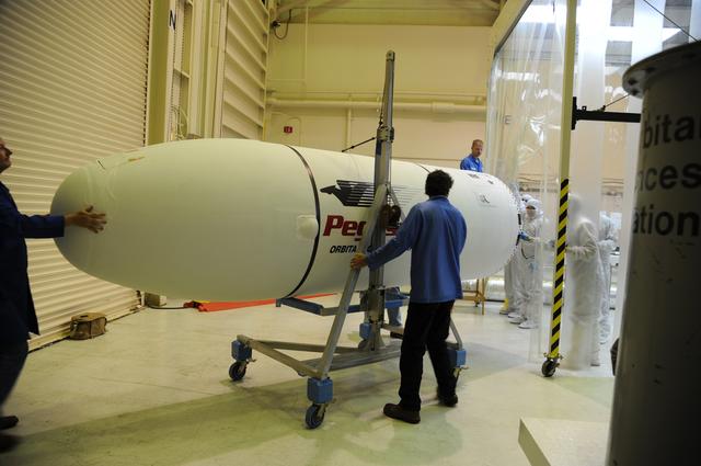 VANDENBERG AIR FORCE BASE, Calif. – In Orbital Sciences’ hangar on Vandenberg Air Force Base in California, technicians roll the second half of the Pegasus fairing into an environmental enclosure for reinstallation around NASA’s Nuclear Spectroscopic Telescope Array, or NuSTAR. Access to the spacecraft was needed for compatibility testing to verify communication with a tracking station in Hawaii. With the change in the launch timeframe to June, this station will be needed to support launch. After processing of Orbital’s Pegasus XL rocket and the spacecraft is complete, they will be flown on Orbital's L-1011 carrier aircraft from Vandenberg, to the U.S. Army's Ronald Reagan Ballistic Missile Defense Test Site on Kwajalein Atoll, part of the Marshall Islands in the Pacific Ocean. The Pegasus, mated to its NuSTAR payload, will be launched from the carrier aircraft 117 nautical miles south of Kwajalein at latitude 6.75 degrees north of the equator. The high-energy X-ray telescope will conduct a census of black holes, map radioactive material in young supernovae remnants, and study the origins of cosmic rays and the extreme physics around collapsed stars. Launch is scheduled for June 13. For more information, visit http://www.nasa.gov/nustar. Photo credit: U.S. Air Force 30th Space Wing/Aaron Taubman, VAFB