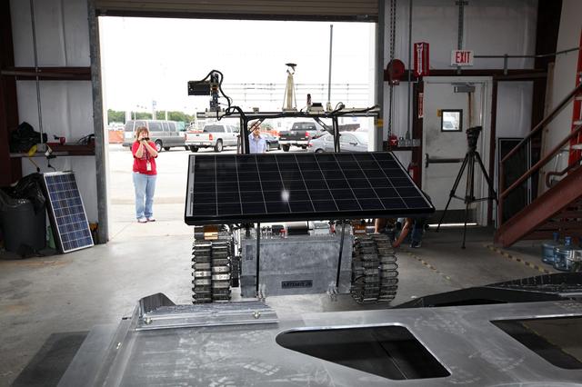 CAPE CANAVERAL, Fla. – In a test facility behind the Operations and Checkout Building at NASA’s Kennedy Space Center in Florida, the prototype rover Artemis Jr. for NASA’s Regolith and Environment Science and Oxygen and Lunar Volatile Extraction, or RESOLVE, project dismounts from the RESOLVE lander during a dry run using ramps attached to the prototype lander. RESOLVE consists of a rover and drill provided by the Canadian Space Agency to support a NASA payload that is designed to prospect for water, ice and other lunar resources. RESOLVE also will demonstrate how future explorers can take advantage of resources at potential landing sites by manufacturing oxygen from soil. NASA will conduct field tests in July outside of Hilo, Hawaii, with equipment and concept vehicles that demonstrate how explorers might prospect for resources and make their own oxygen for survival while on other planetary bodies. For more information, visit http://www.nasa.gov/exploration/analogs/index.html. Photo credit: NASA/Dimitri Gerondidakis