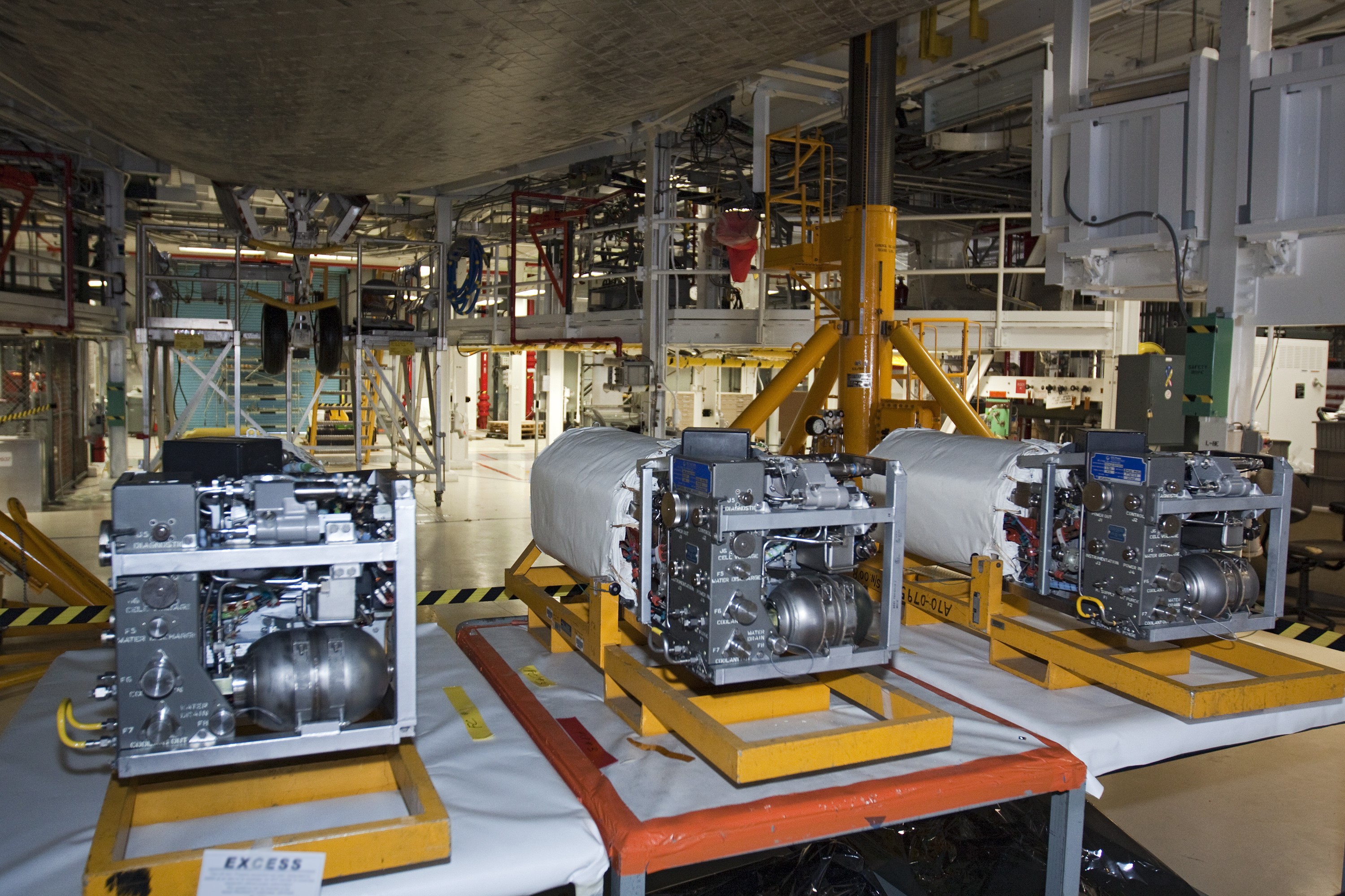 CAPE CANAVERAL, Fla. – Inside Orbiter Processing Facility-1 at NASA’s Kennedy Space Center in Florida, three excessed fuel cells are on a work bench beneath space shuttle Atlantis. The left orbital maneuvering system, or OMS, pod has been installed onto Atlantis. The OMS provided the shuttle with thrust for orbit insertion, rendezvous and deorbit, and could provide up to 1,000 pounds of propellant to the aft reaction control system. The OMS is housed in two independent pods located on each side of the shuttle’s aft fuselage. Each pod contains one OMS engine and the hardware needed to pressurize, store and distribute the propellants to perform the velocity maneuvers. Atlantis’ OMS pods were removed and sent to White Sands Test Facility in New Mexico to be cleaned of residual toxic propellant. The work is part of the Space Shuttle Program’s transition and retirement processing of the space shuttle fleet. A groundbreaking was held Jan. 18 for Atlantis’ future home, a 65,000-square-foot exhibit hall in Shuttle Plaza at the Kennedy Space Center Visitor Complex. Atlantis is scheduled to roll over to the visitor complex in November in preparation for the exhibit’s grand opening in July 2013. For more information, visit http://www.nasa.gov/transition. Photo credit: NASA/Ben Smegelsky