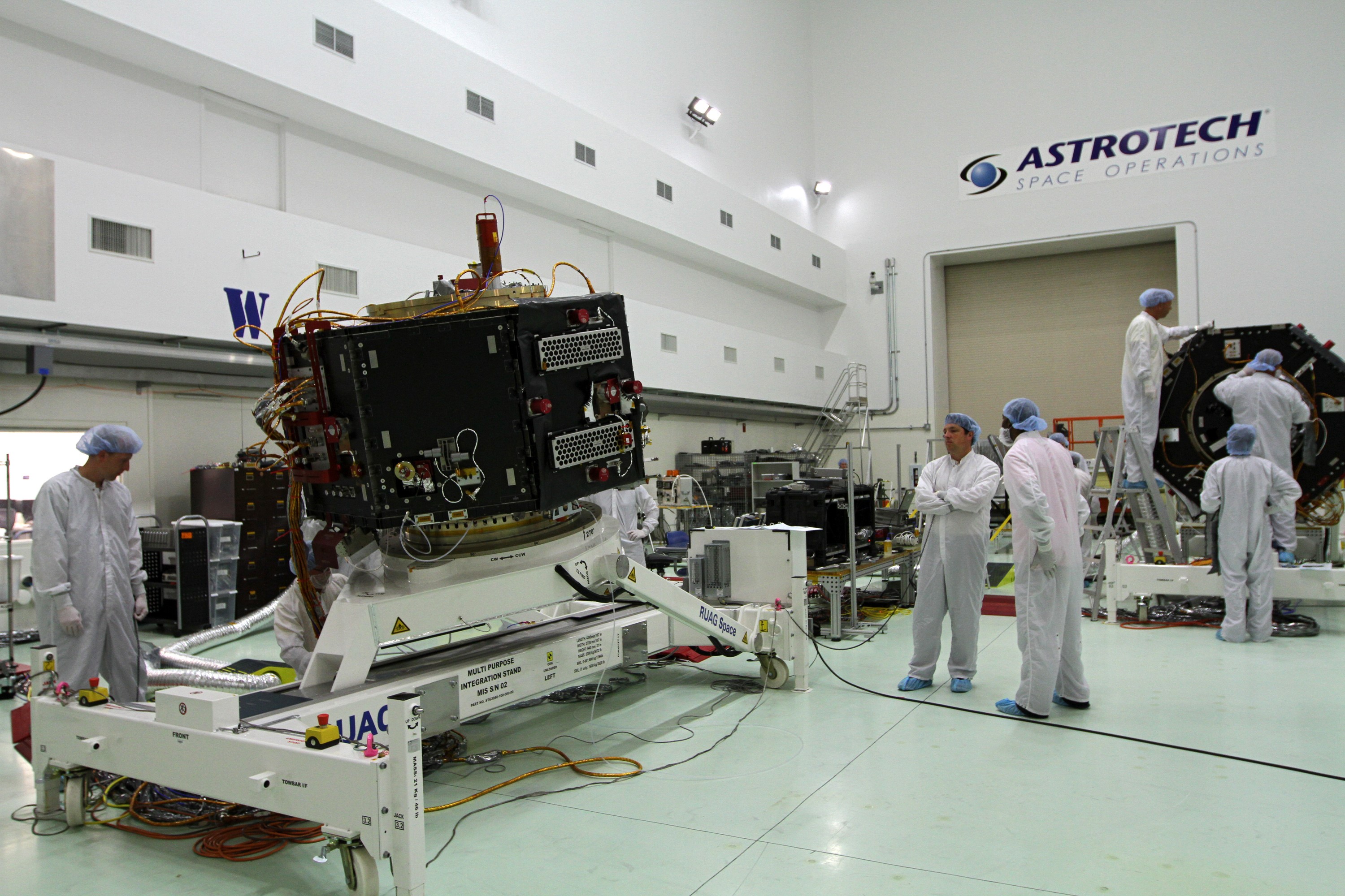 CAPE CANAVERAL, Fla. – Inside the Astrotech payload processing facility near NASA’s Kennedy Space Center in Florida, technicians monitor the progress as the Radiation Belt Storm Probes, or RBSP, spacecraft B is lowered to a horizontal position. The RBSP had been in a vertical position for testing. NASA’s RBSP mission will help us understand the sun’s influence on Earth and near-Earth space by studying the Earth’s radiation belts on various scales of space and time. RBSP will begin its mission of exploration of Earth’s Van Allen radiation belts and the extremes of space weather after its launch aboard a United Launch Alliance Atlas V rocket. Launch is targeted for Aug. 23. For more information, visit http://www.nasa.gov/rbsp. Photo credit: NASA/Kim Shiflett