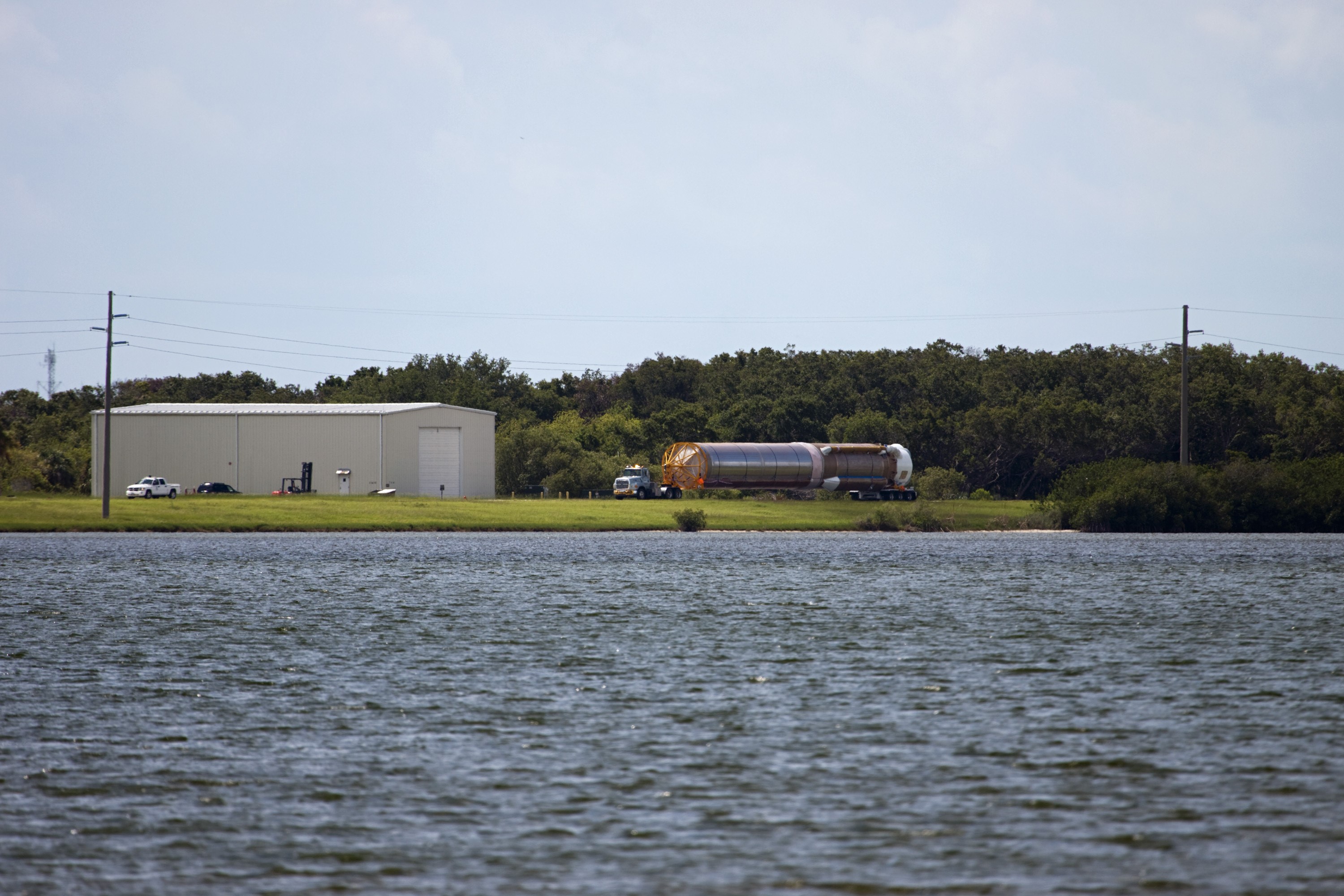 CAPE CANAVERAL, Fla. – The United Launch Alliance Atlas V first stage booster for NASA's Radiation Belt Storm Probes mission travels through Cape Canaveral Air Force Station in Florida en route to the Atlas Spaceflight Operations Center, or ASOC. The Radiation Belt Storm Probes, or RBSP, mission will help us understand the sun’s influence on Earth and near-Earth space by studying the Earth’s radiation belts on various scales of space and time. For more information, visit http://www.nasa.gov/rbsp. Photo credit: NASA/Jim Grossmann