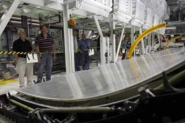 CAPE CANAVERAL, Fla. – Inside Orbiter Processing Facility-2 at NASA’s Kennedy Space Center in Florida, United Space Alliance technicians monitor the progress of space shuttle Endeavour’s payload bay doors as they are closed for the final time. The work is part of Transition and Retirement of the remaining space shuttles, Endeavour and Atlantis. Endeavour is being prepared for public display at the California Science Center in Los Angeles. Its ferry flight to California is targeted for mid-September. Endeavour was the last space shuttle added to NASA’s orbiter fleet. Over the course of its 19-year career, Endeavour spent 299 days in space during 25 missions. For more information, visit http://www.nasa.gov/shuttle. Photo credit: NASA/Kim Shiflett