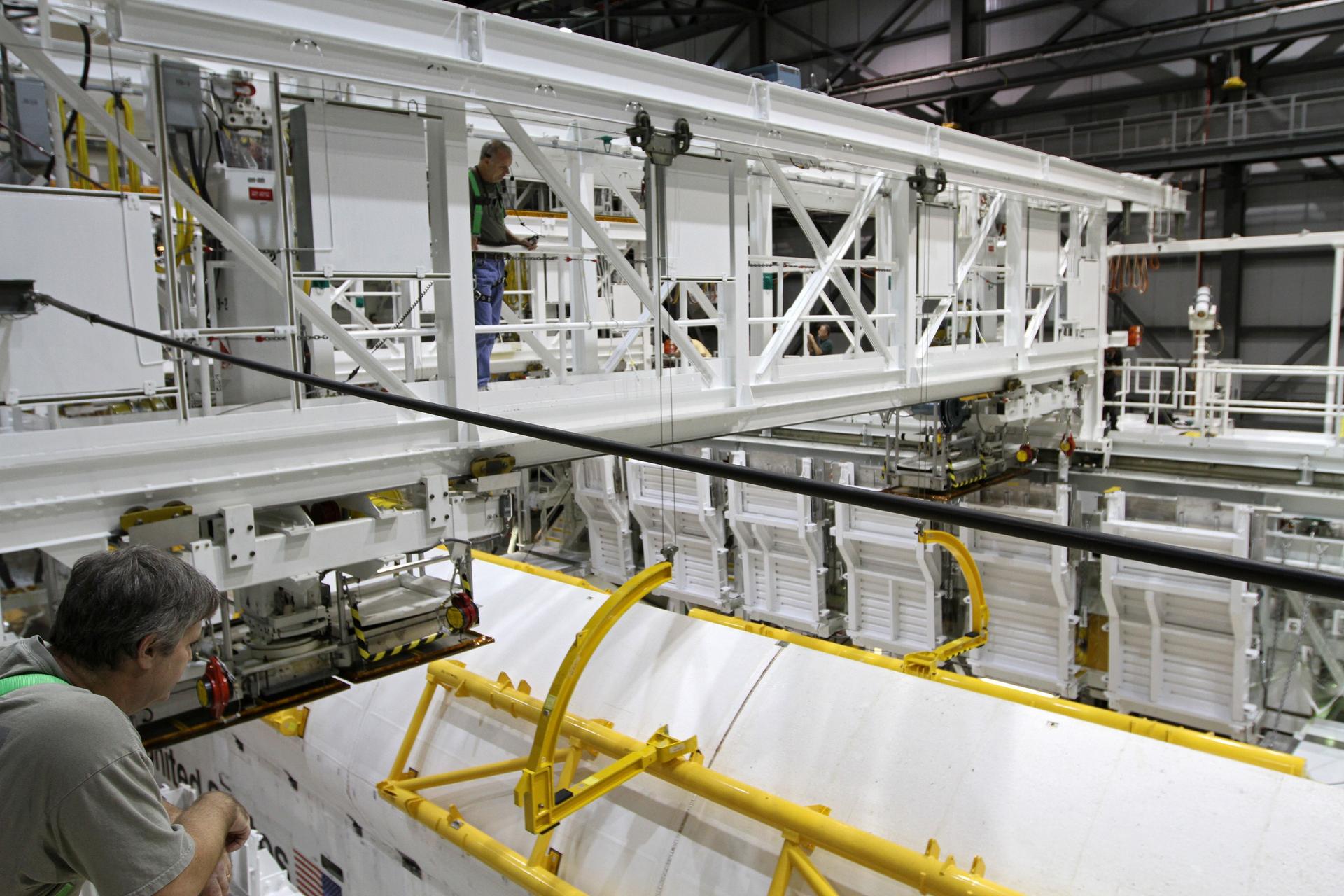 CAPE CANAVERAL, Fla. – Inside Orbiter Processing Facility-2 at NASA’s Kennedy Space Center in Florida, one of space shuttle Endeavour’s payload bay doors is closed as United Space Alliance technicians monitor the progress of the second door’s closure. Endeavour’s payload bay doors are being closed for the final time. The work is part of Transition and Retirement of the remaining space shuttles, Endeavour and Atlantis. Endeavour is being prepared for public display at the California Science Center in Los Angeles. Its ferry flight to California is targeted for mid-September. Endeavour was the last space shuttle added to NASA’s orbiter fleet. Over the course of its 19-year career, Endeavour spent 299 days in space during 25 missions. For more information, visit http://www.nasa.gov/shuttle. Photo credit: NASA/Kim Shiflett