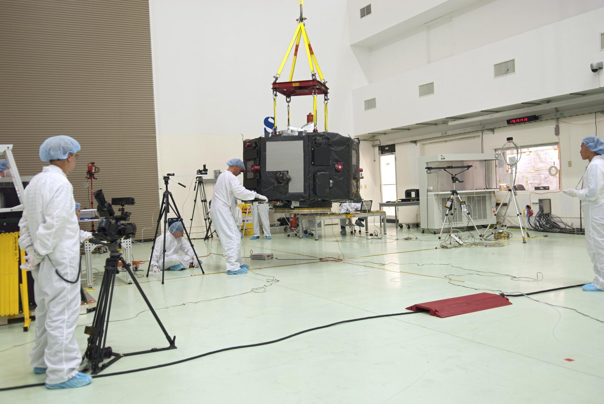 CAPE CANAVERAL, Fla. – Inside the Astrotech payload processing facility near NASA’s Kennedy Space Center in Florida, technicians line up the Radiation Belt Storm Probes, or RBSP, spacecraft A over an electromagnetic source in order to perform a magnetic swing test. The magnetic swing test is performed to characterize the magnetic signature of the spacecraft so that when it is taking measurements with its sensors in space scientists can subtract out background noise from the spacecraft itself. NASA’s RBSP mission will help us understand the sun’s influence on Earth and near-Earth space by studying the Earth’s radiation belts on various scales of space and time. RBSP will begin its mission of exploration of Earth’s Van Allen radiation belts and the extremes of space weather after its launch aboard a United Launch Alliance Atlas V rocket. Launch is targeted for Aug. 23. For more information, visit http://www.nasa.gov/rbsp. Photo credit: NASA/Charisse Nahser
