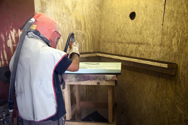 CAPE CANAVERAL, Fla. – At C Spray Glass Blasting of Cocoa Beach, Fla., a worker completes the commemorative plaque to mark space shuttle Atlantis’ wheel stop location. The special plaque will be permanently mounted at the Shuttle Landing Facility, or SLF, runway edge at NASA’s Kennedy Space Center in Florida to commemorate the final space shuttle landing. Atlantis completed the STS-135 mission by landing at the SLF on July 21, 2011, at 5:57 a.m. EDT. Atlantis flew 33 missions, completed 4,848 orbits of the Earth, traveled nearly 126 million miles and spent 307 days in space. Atlantis carried 207 astronauts to space. Photo credit: NASA/Lorne Mathre