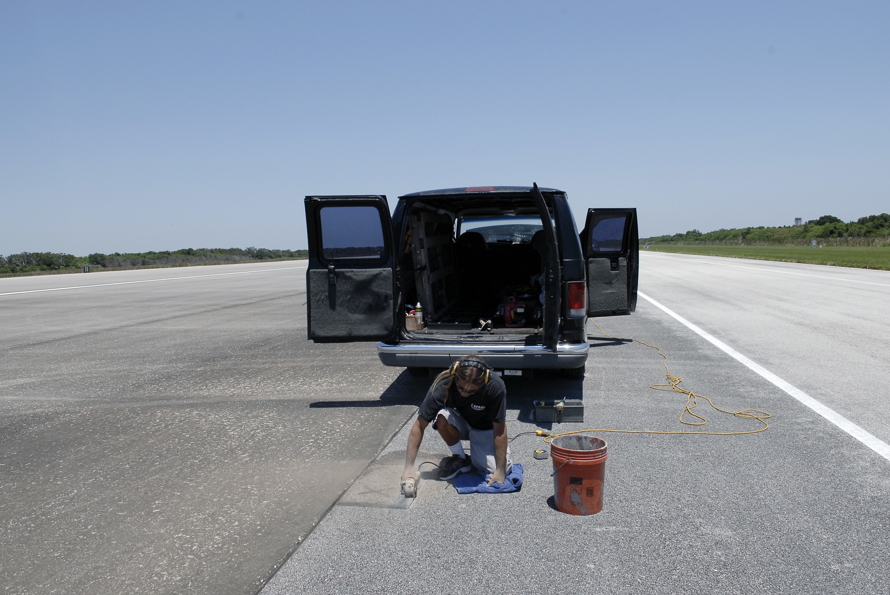 CAPE CANAVERAL, Fla. - At the Shuttle Landing Facility SLF at NASA’s Kennedy Space Center in Florida, Chad Stout with C Spray Glass Blasting in Cocoa, Fla., prepares to install a special plaque to mark the nose gear wheel stop of space shuttle Atlantis. Stout is cutting the 15,000 by 1,000-foot-long concrete runway to accommodate the black granite plaque, which is 16 by 28 inches. It is the third plaque permanently mounted to commemorate the final landing of each of the three orbiters. Atlantis completed the STS-135 mission by landing at the SLF on July 21, 2011, at 5:57 a.m. Atlantis flew 33 missions, completed 4,848 orbits of the Earth, traveled nearly 126 million miles and spent 307 days in space. Atlantis carried 207 astronauts to space. Photo credit: NASA/Charisse Nahser